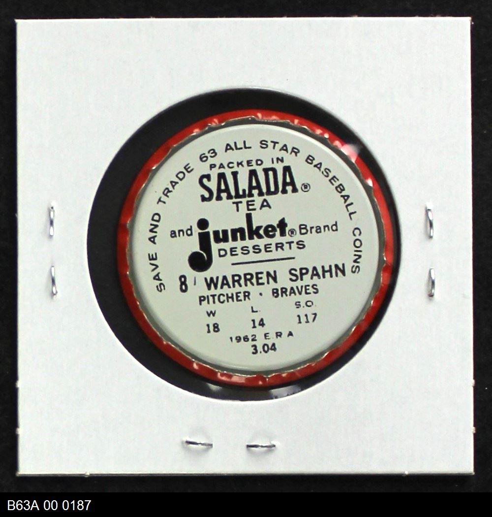 | 1963 Salada Metal Coins #8 Warren Spahn | 7 - NM | Front | Back |