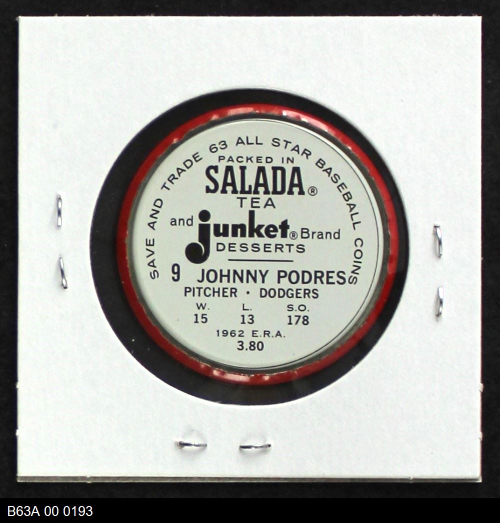 | 1963 Salada Metal Coins #9 Johnny Podres | 7 - NM | Front | Back |