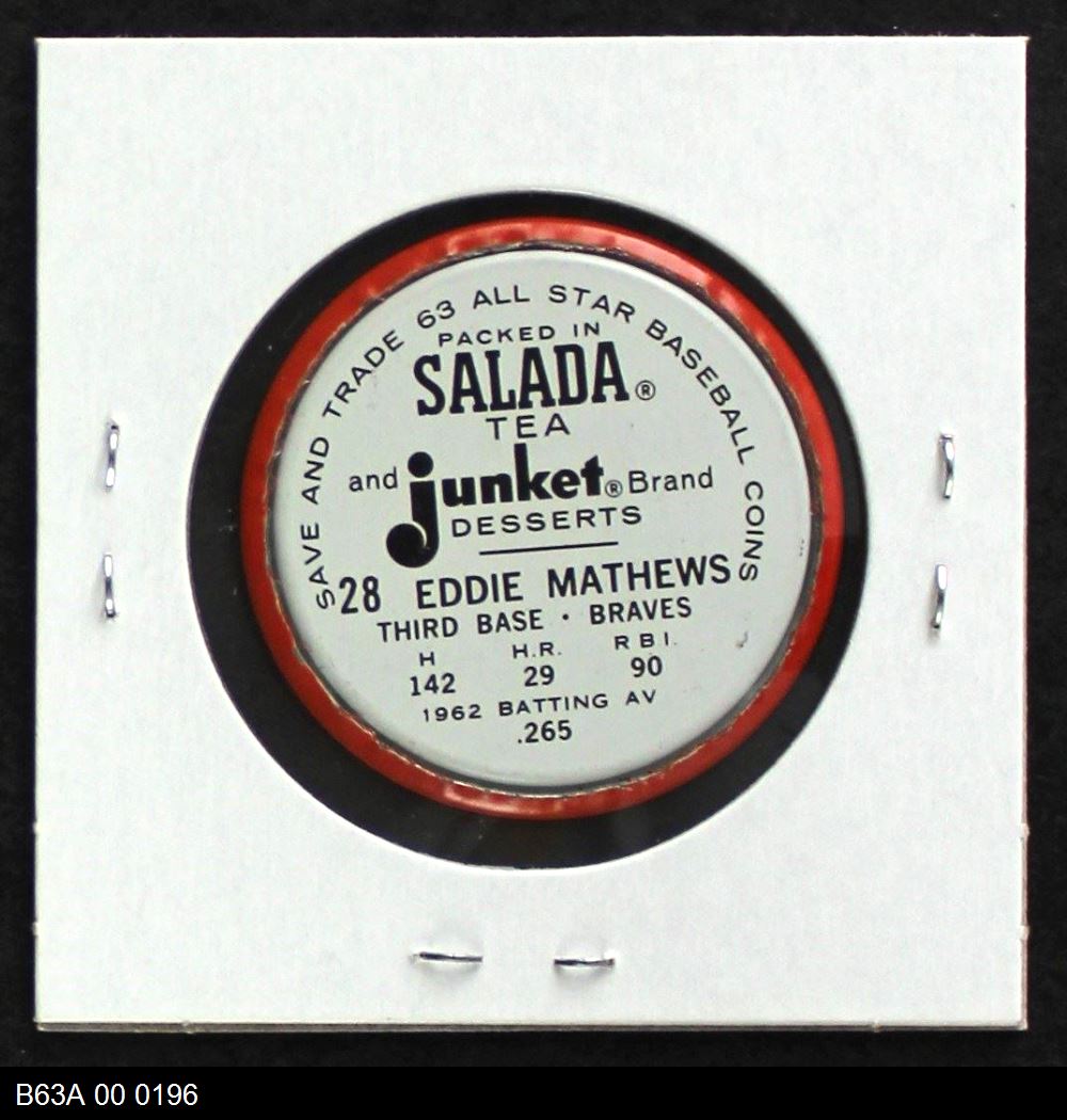 | 1963 Salada Metal Coins #28 Eddie Mathews | 7 - NM | Front | Back |