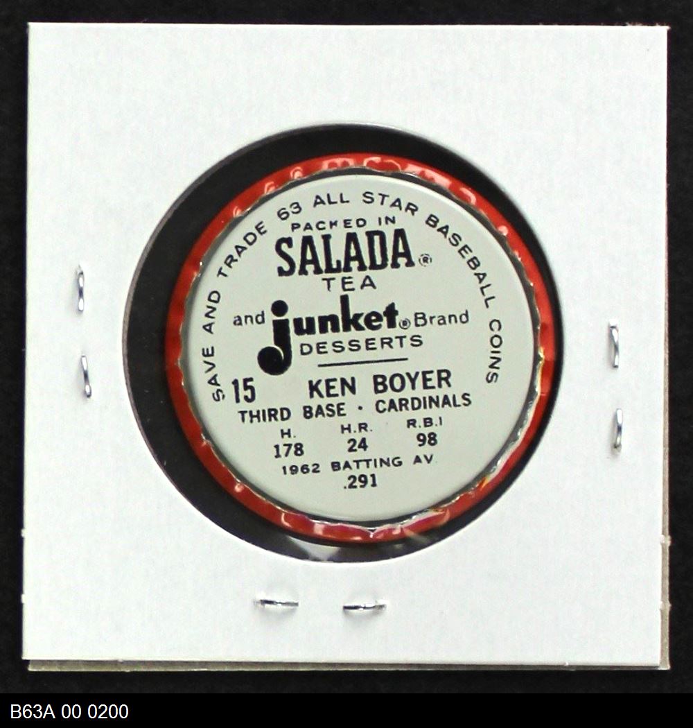 | 1963 Salada Metal Coins #15 Ken Boyer | 6 - EX/MT | Front | Back |