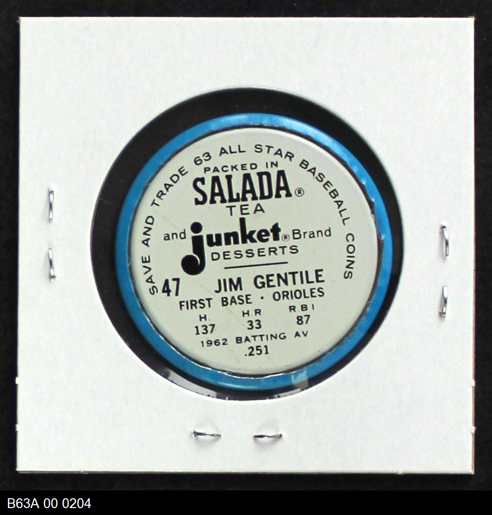 | 1963 Salada Metal Coins #47 Jim Gentile | 6 - EX/MT | Front | Back |