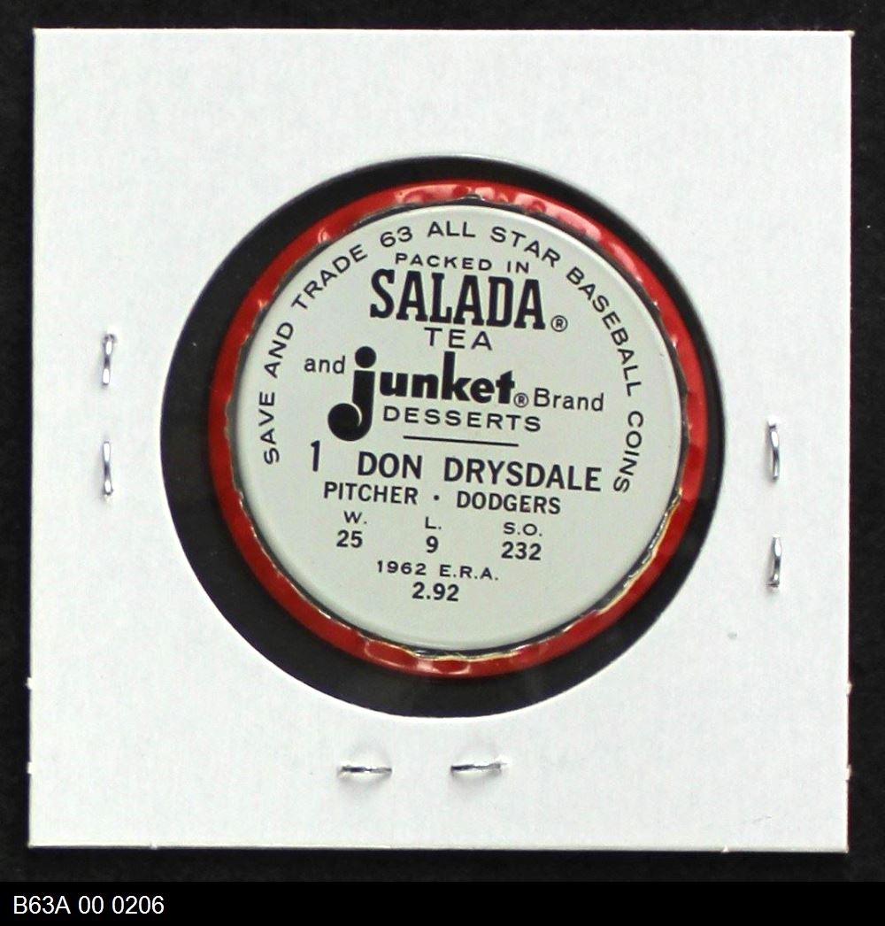| 1963 Salada Metal Coins #1 Don Drysdale | 6 - EX/MT | Front | Back |
