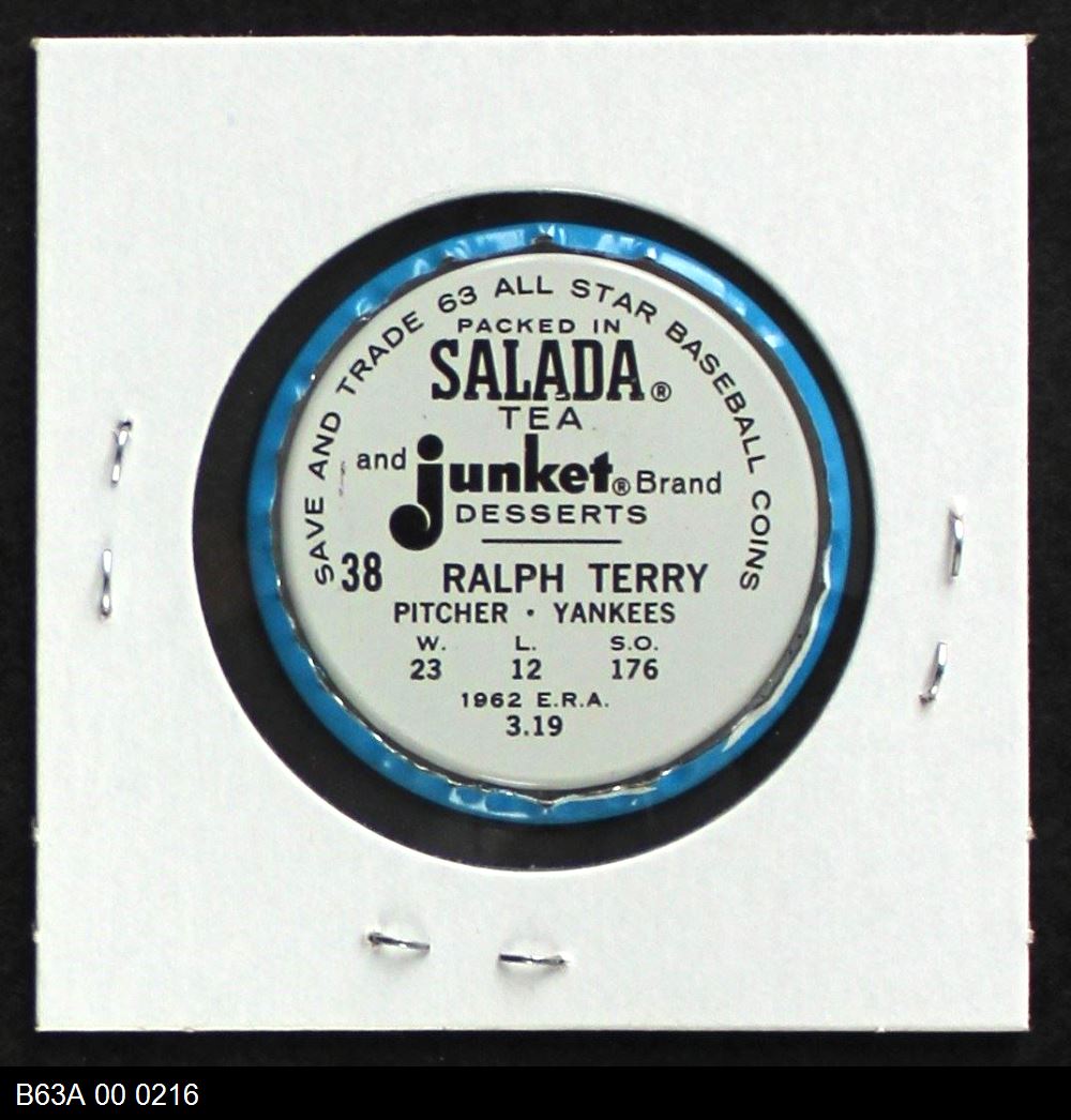 | 1963 Salada Metal Coins #38 Ralph Terry | 6 - EX/MT | Front | Back |
