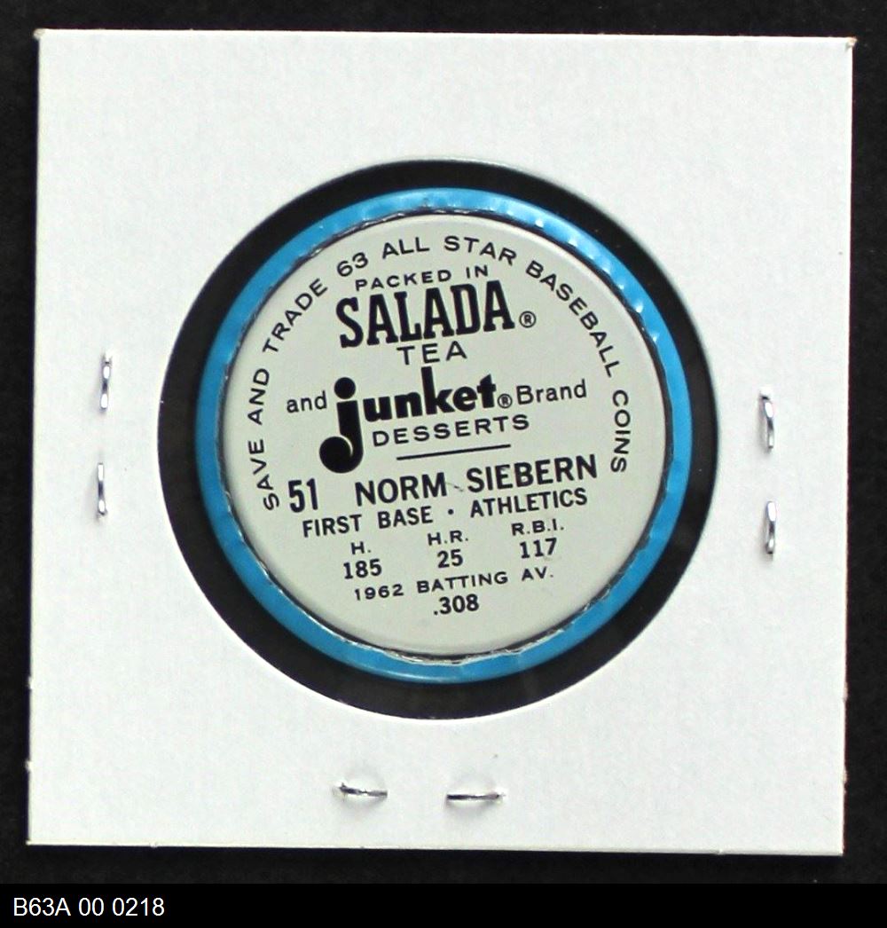| 1963 Salada Metal Coins #51 Norm Siebern | 6 - EX/MT | Front | Back |