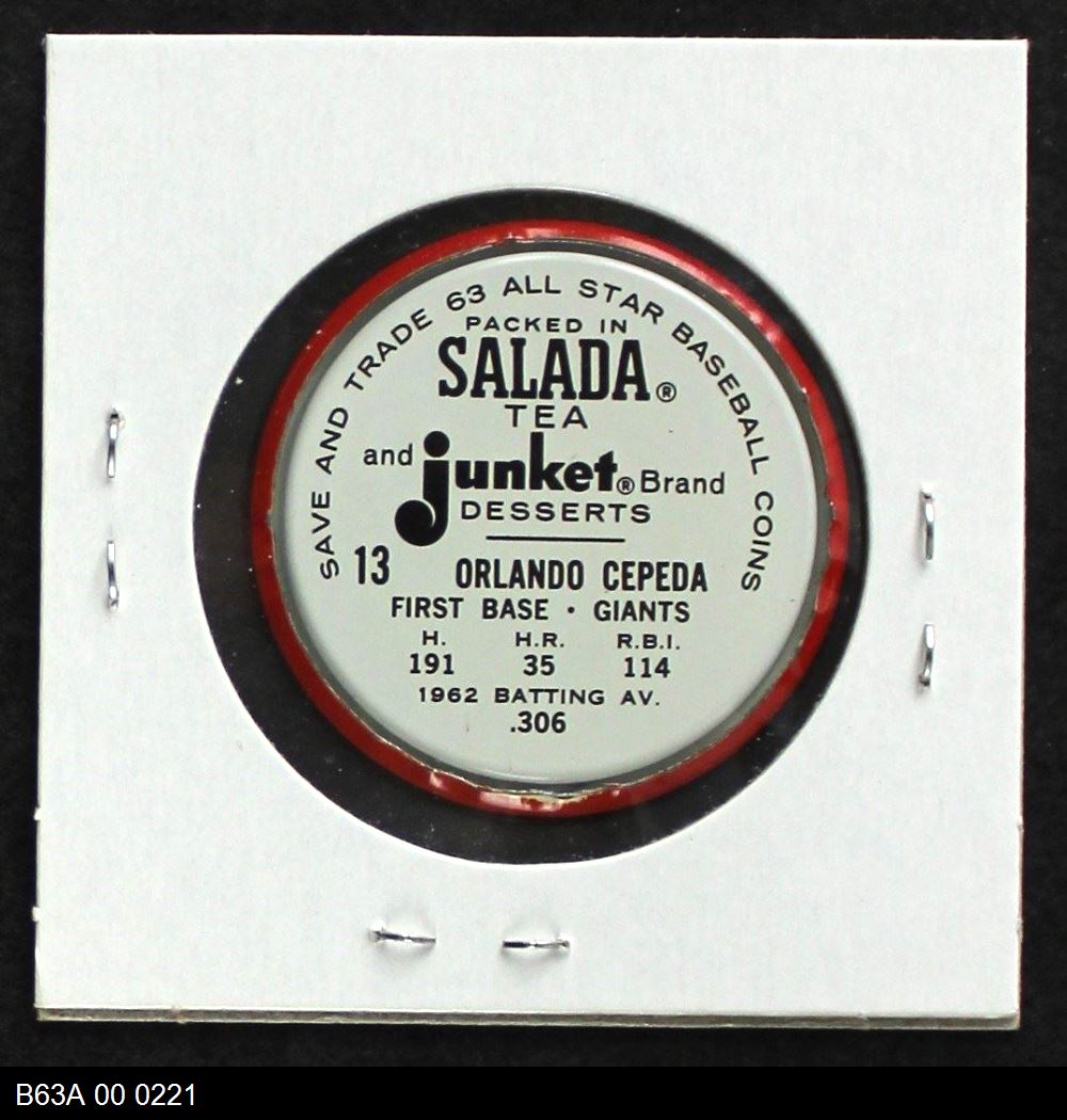| 1963 Salada Metal Coins #13 Orlando Cepeda | 6 - EX/MT | Front | Back |
