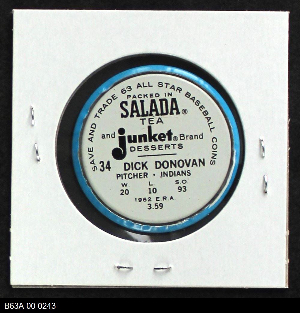 | 1963 Salada Metal Coins #34 Dick Donovan | 5 - EX | Front | Back |