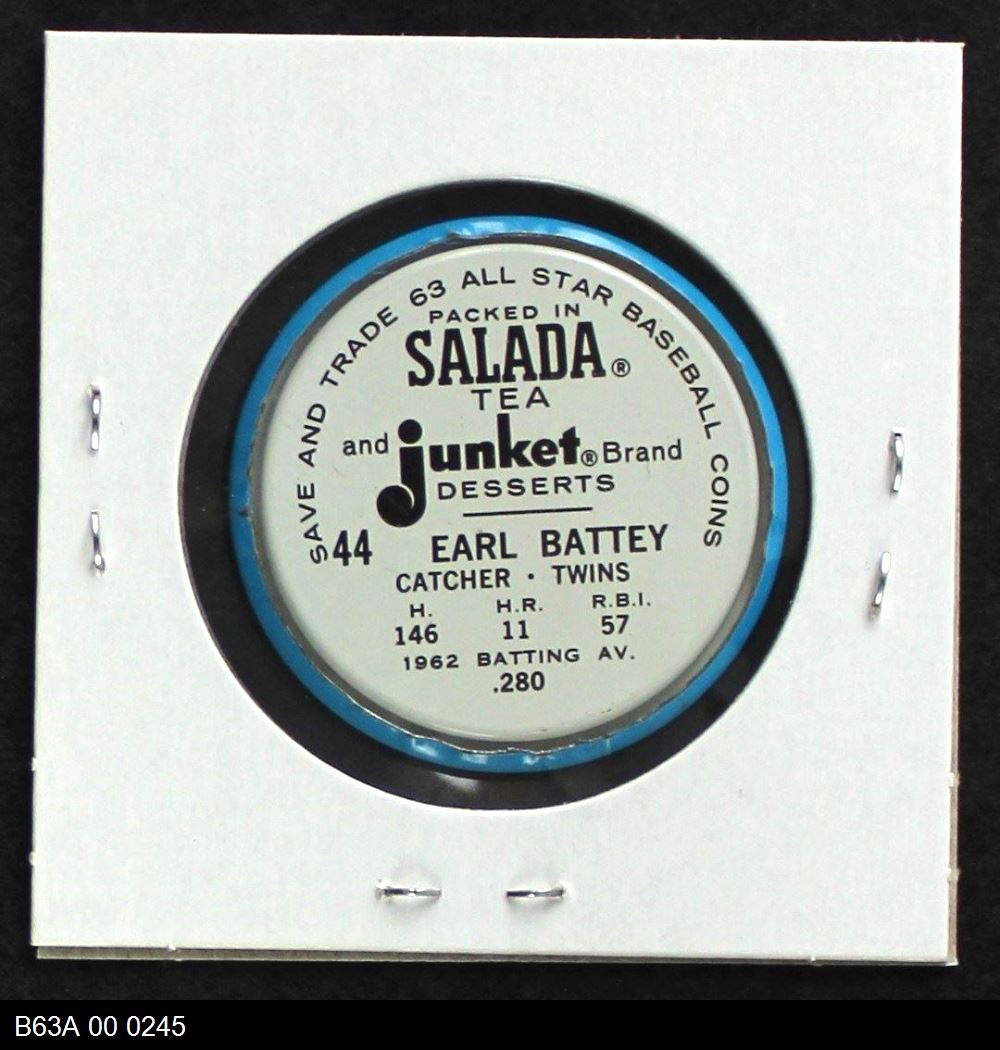 | 1963 Salada Metal Coins #44 Earl Battey | 5 - EX | Front | Back |