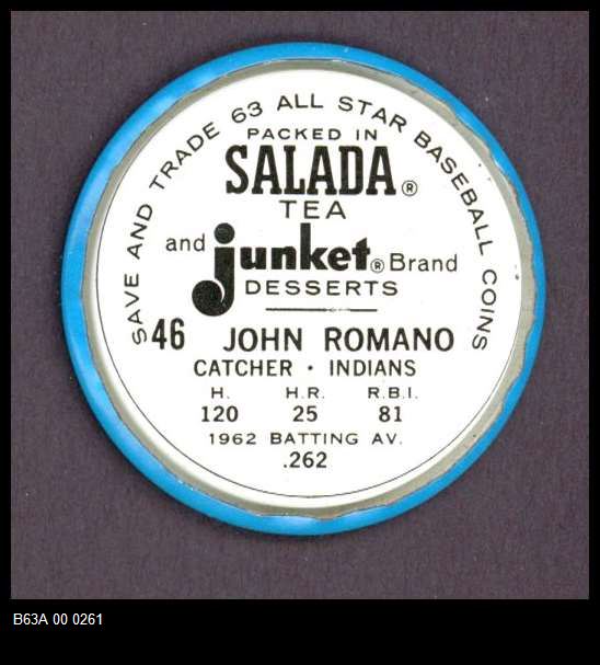 | 1963 Salada Metal Coins #46 John Romano | 7 - NM | Front | Back |