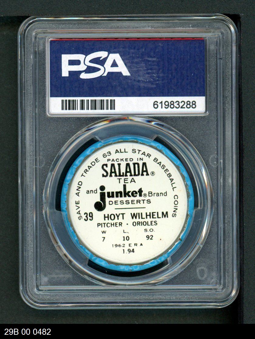 | 1963 Salada Metal Coins #39 Hoyt Wilhelm | PSA 6 - EX/MT | Front | Back |