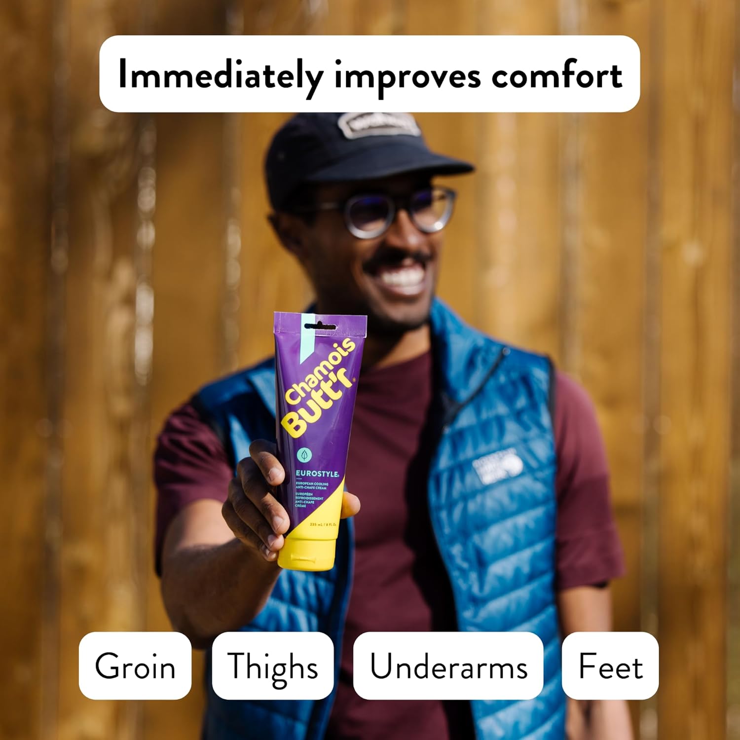 Stay comfortable on every ride with Chamois Butt’r Eurostyle Anti-Chafe Cream. Designed for serious cyclists, this high-end European style cream contains menthol and witch hazel to provide a soothing and cooling effect, reducing irritation and chafing during long rides. Apply directly to your skin or cycling shorts pad before riding for immediate comfort.