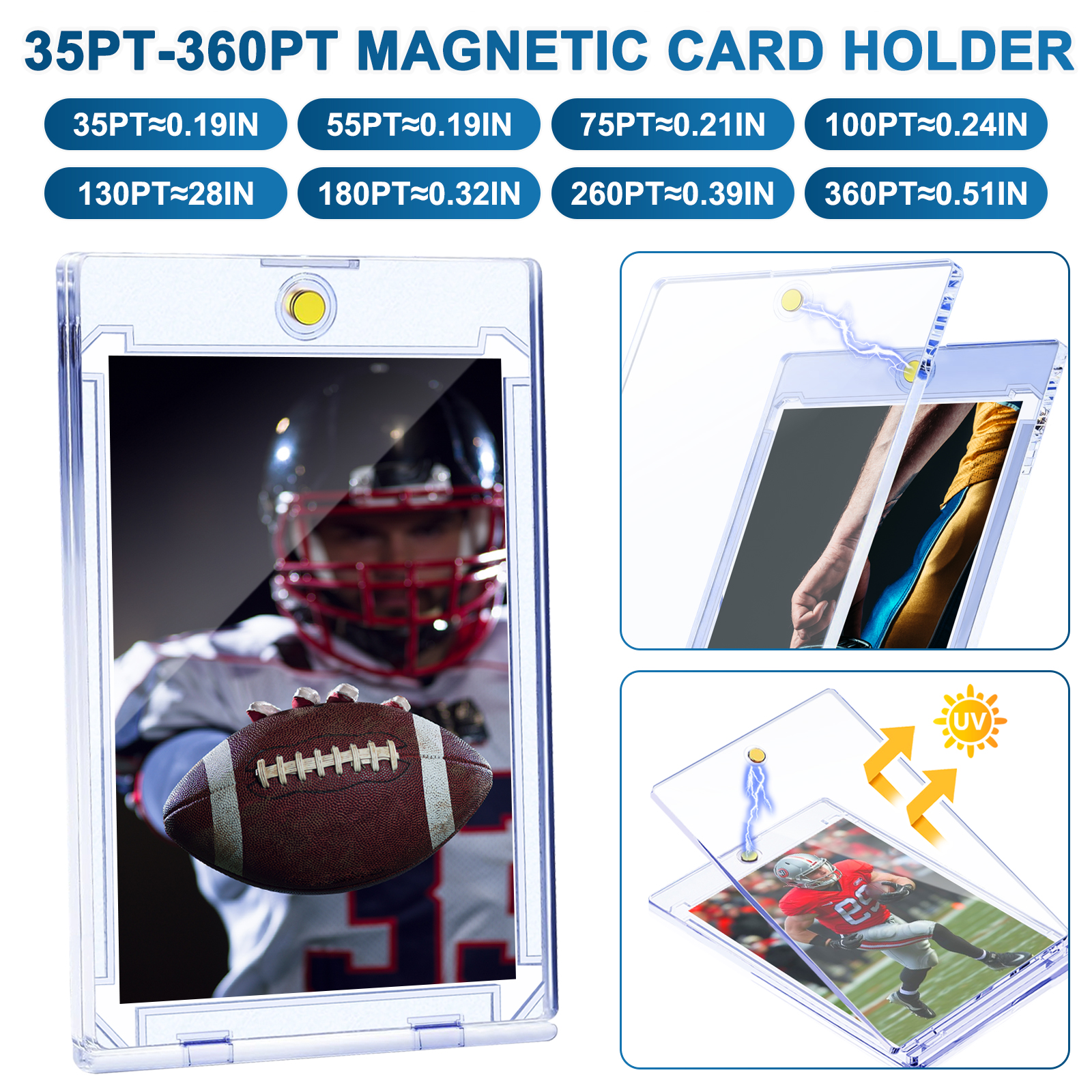 Standard Card Size: The Magnetic Card Holder fits the standard trading card size (2.5"x 3.5") up to 35PT-360PT point thickness. The trading card holder is suitable for baseball cards, basketball cards, football cards, hockey cards, and MORE.