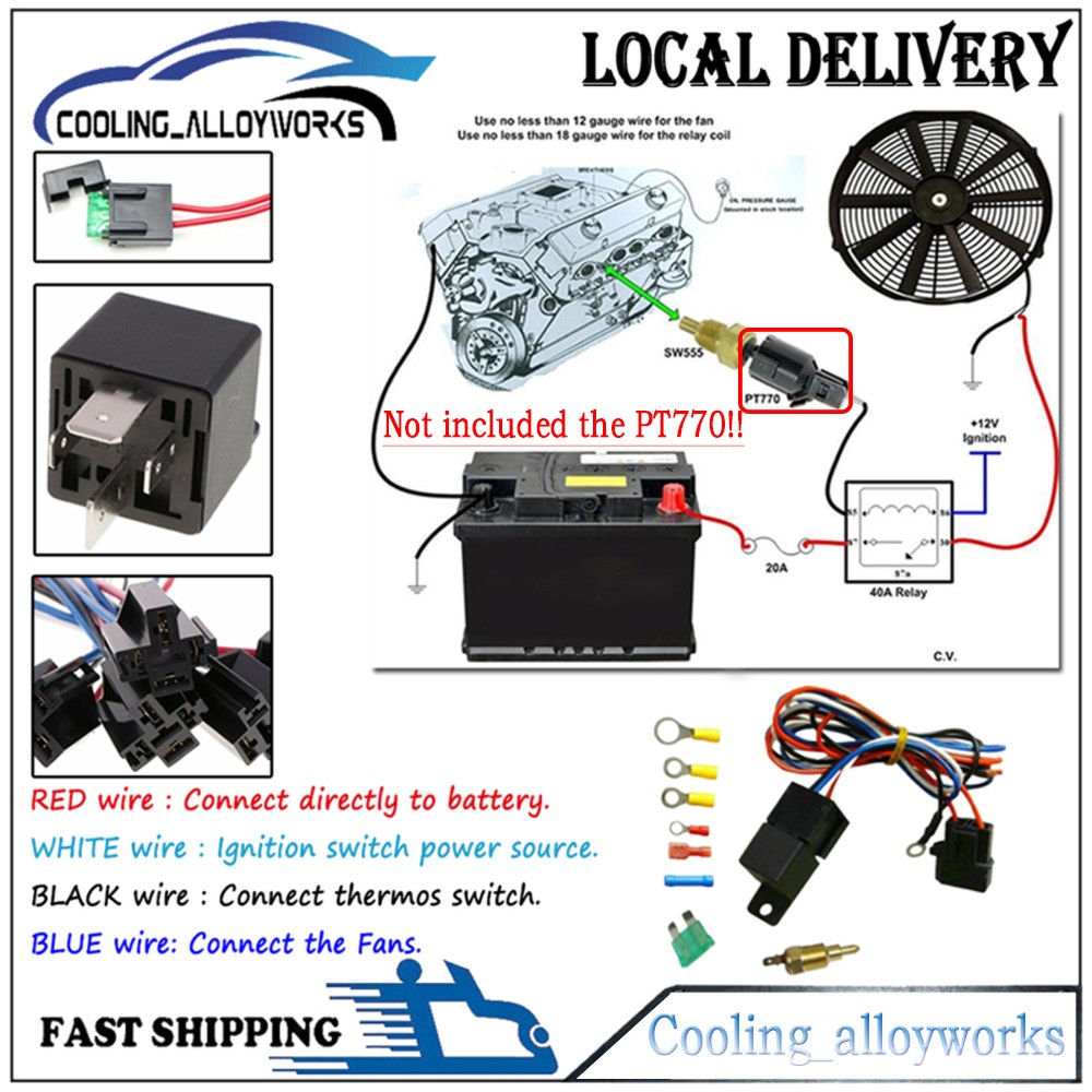 Thermostat Kit Installation: Universal fit for any automotive vehicle and electric fan. Activates by grounding electric fans at preset temperature. 180'F turn-on temperature, 165'F turn-off temperature. RED + connect directly to battery. WHITE wire to ignition switch power source. BLACK goes to thermos switch. BLUE wire goes to the Fans. This set up will run Fans & pull air in through radiator. 1969-1970 Mercury Cougar V8 5.8L Engine with AC