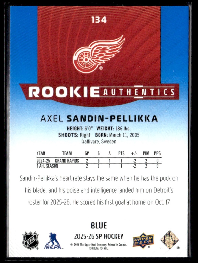| 2025-26 Upper Deck Rookie Authentics Blue Axel Sandin-Pellikka RC Red Wings #134 | ||||||||||||||||||||