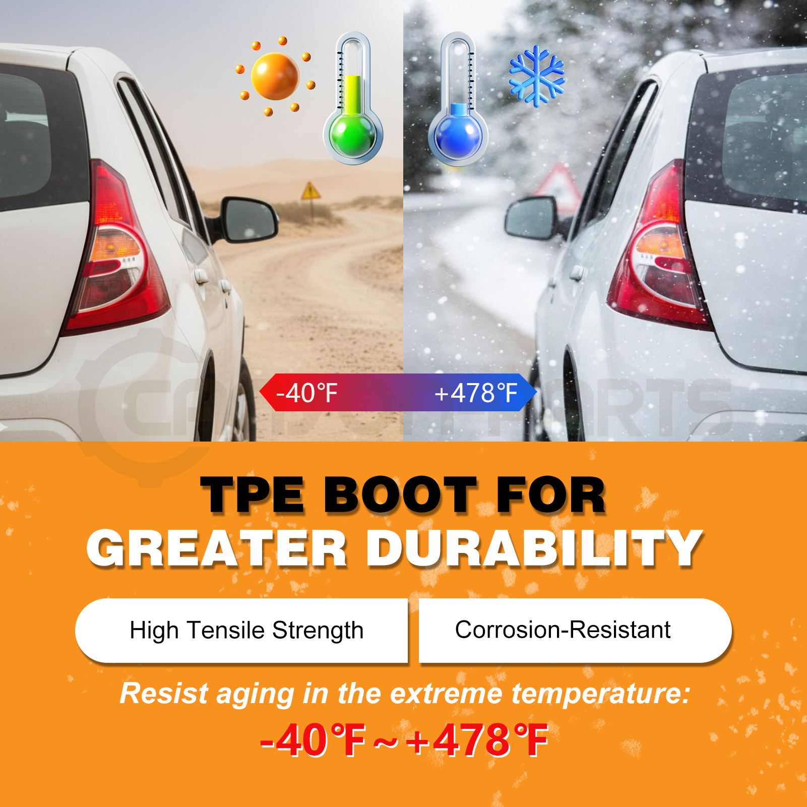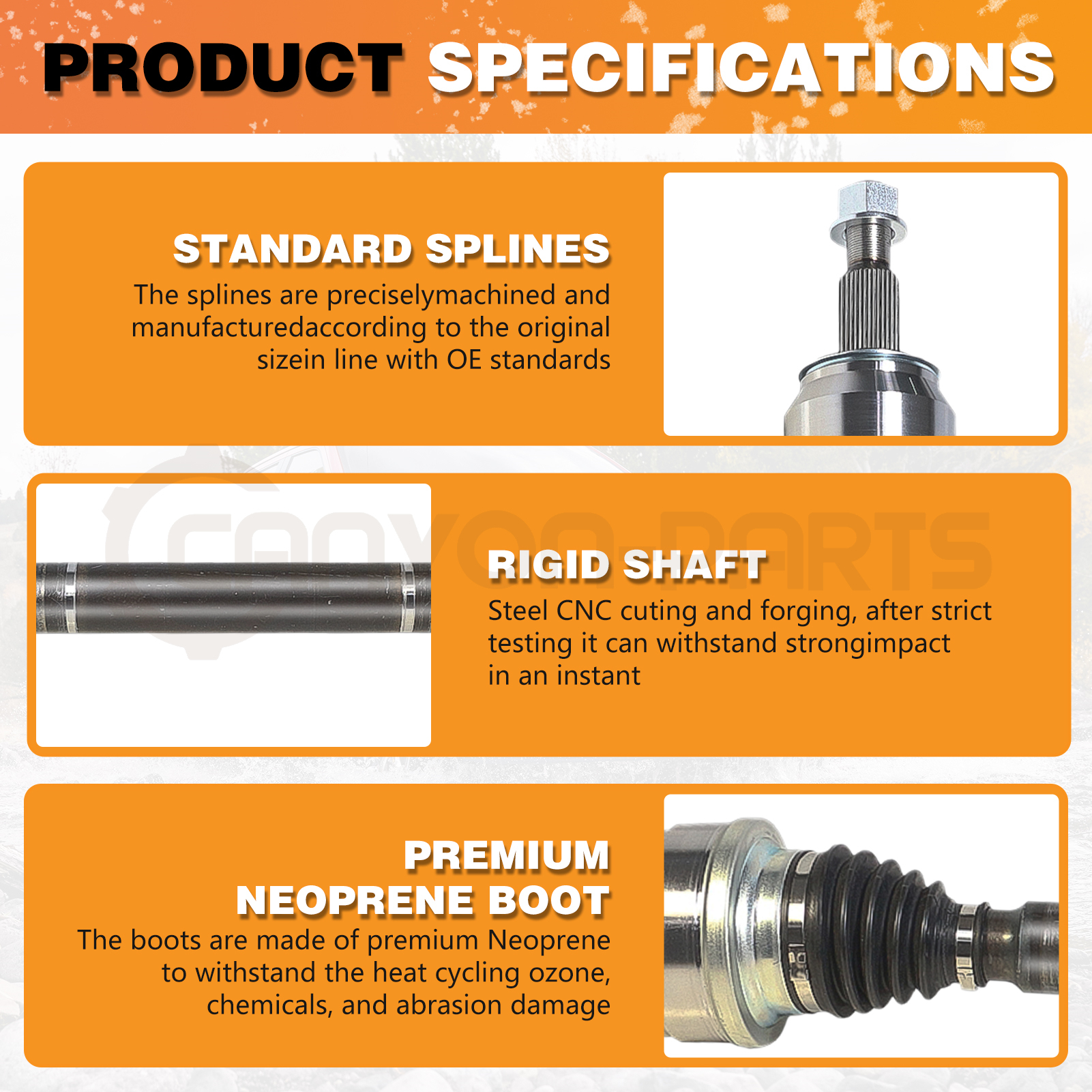 High Quality-- CV Axles are manufactures with high quality neoprene boots and fastened with stainless steel straps to protect from breaking.