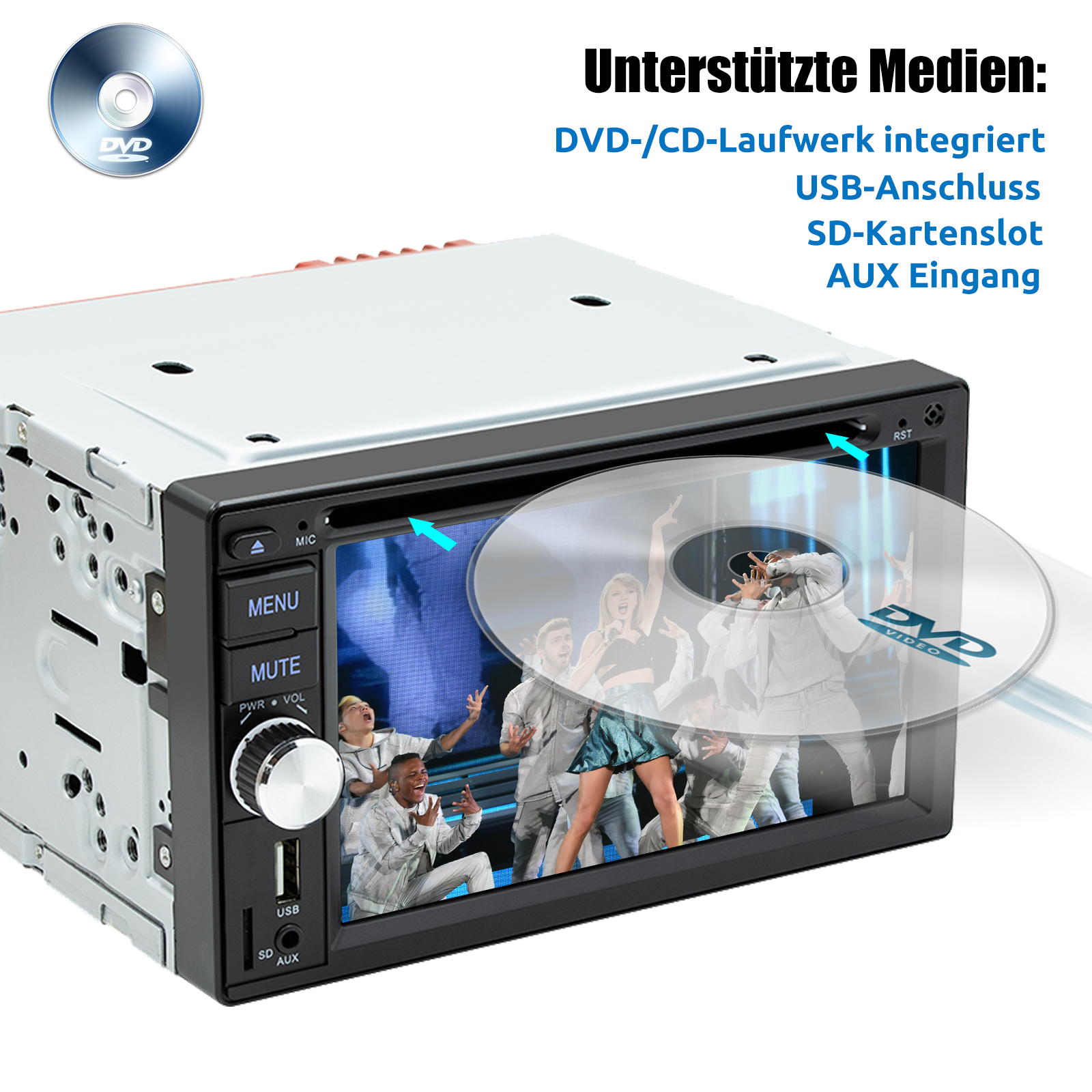 Auto Multimedia player mit DVD/CD: Der Autoradio-CD-DVD-Player ist kompatibel mit den meisten Audio- und Videoformaten . Sie können während der Fahrt Radio hören. DVD-Videos können Ihre Lieblingssongs abspielen.