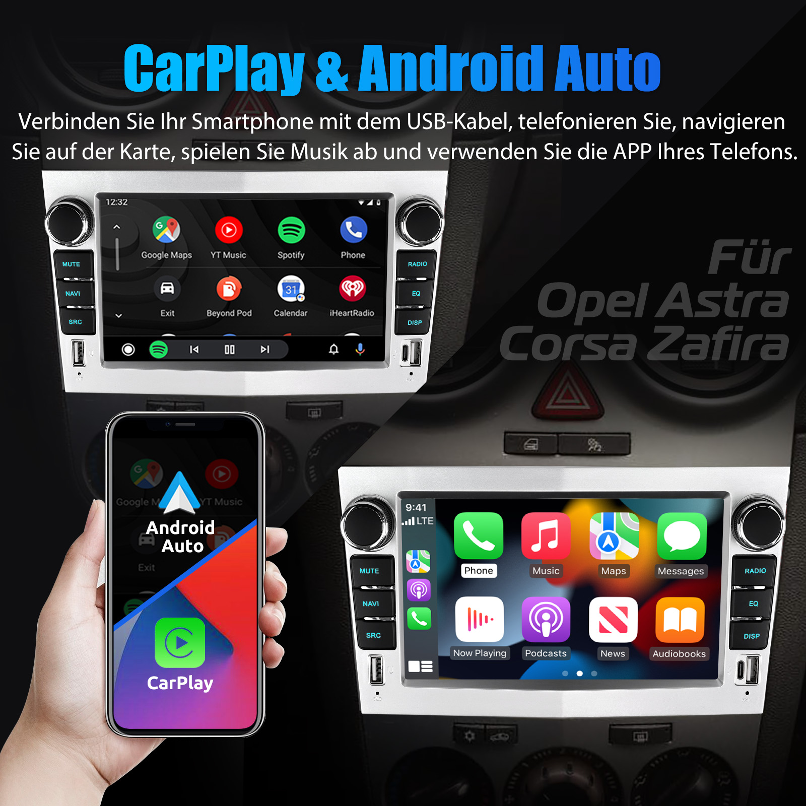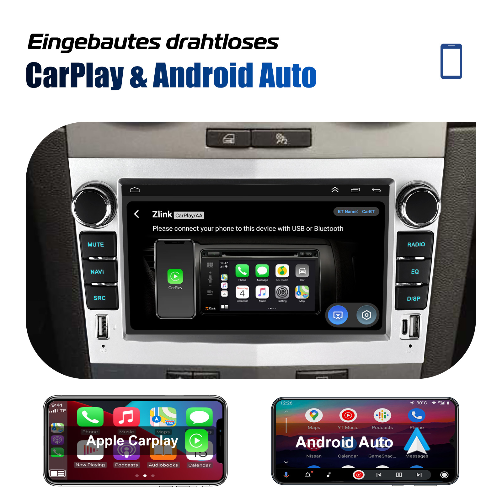 Drahtloses Carplay und Android Auto: Tauchen Sie ein in ein nahtloses und benutzerfreundliches Infotainment-Erlebnis mit Apple CarPlay & Android Auto. Verbinden Sie Ihr iPhone mit Apple CarPlay oder Ihr Android-Smartphone mit Android Auto und greifen Sie sicher auf Anrufe, Textnachrichten, Navigation, Musik und vieles mehr zu. Mit intuitiver Bedienung über den Touchscreen oder Sprachsteuerung haben Sie alle Funktionen bequem zur Hand, während Sie sicher am Steuer bleiben. Nutzen Sie Ihre bevorzugten Apps und bleiben Sie jederzeit verbunden, während Sie den Blick auf die Straße gerichtet haben. Machen Sie Ihr Fahrzeug zu einem erweiterten Hub für Ihre mobilen Geräte und erleben Sie eine neue Dimension des Infotainments.