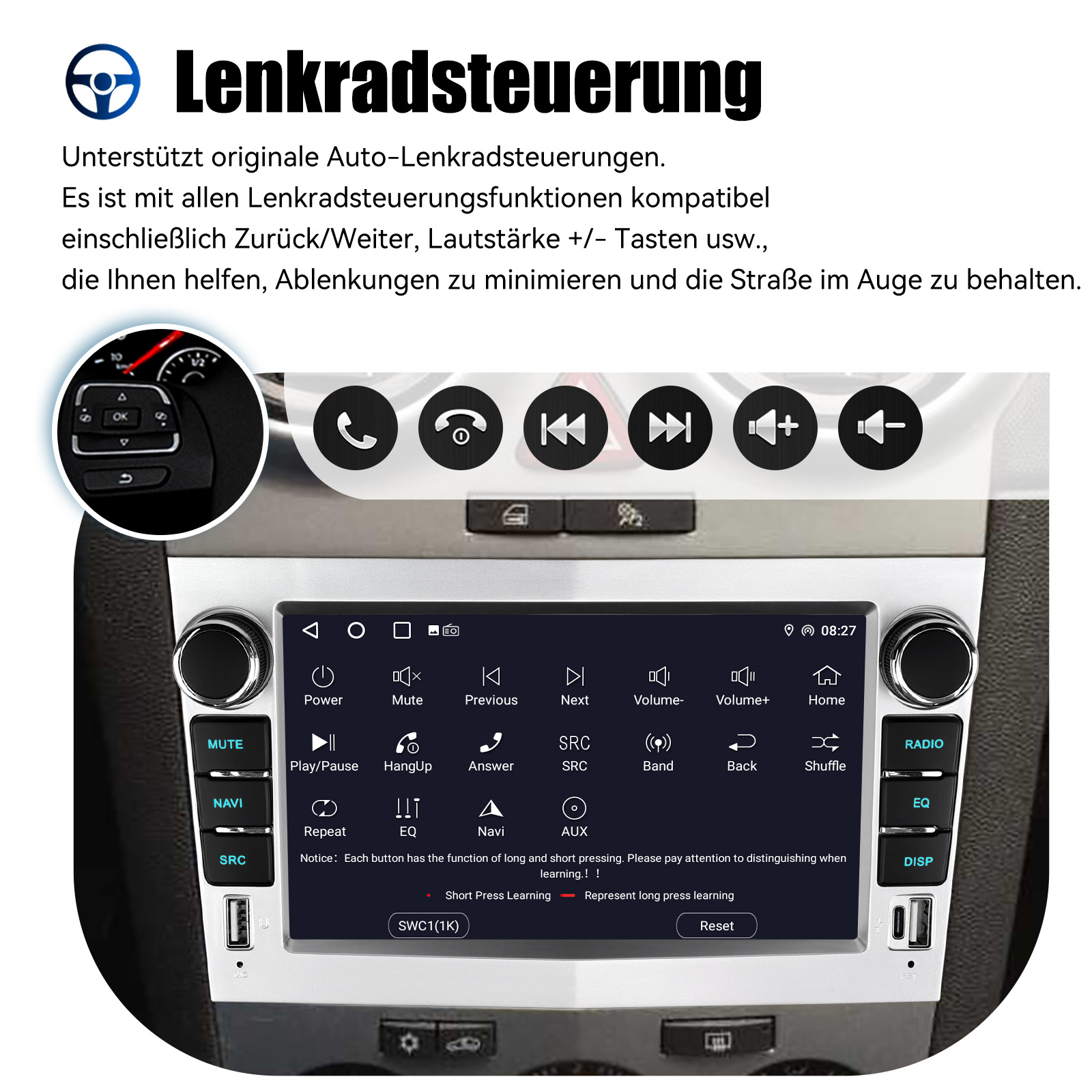Rückfahrkameraeingang und Lenkradkontrolle: Nach dem Anschluss an die Rückfahrkamera. Das Radio zeigt automatisch das Rückfahrbild an, sobald Sie den Rückwärtsgang einlegen. Machen Sie Ihr tägliches Rückwärtsfahren sicherer. Unterstützt AHD-Kamera. Unterstützt die originale Auto-Lenkradsteuerung (wenn Ihr Auto Canbus nicht unterstützt und SIE die Lenkradtasten lernen), um das Fahren bequemer und sicherer zu machen.