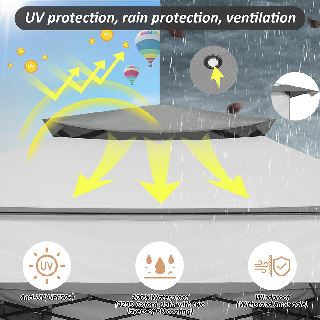 - SUPERIOR QUALITY: The gazebo top is made of 420D Oxford fabric, with UPF 50+ UV sun protection to help block up to 99% of harmful UV rays. And the frame is superior, made of sturdy, high-grade engineered steel.