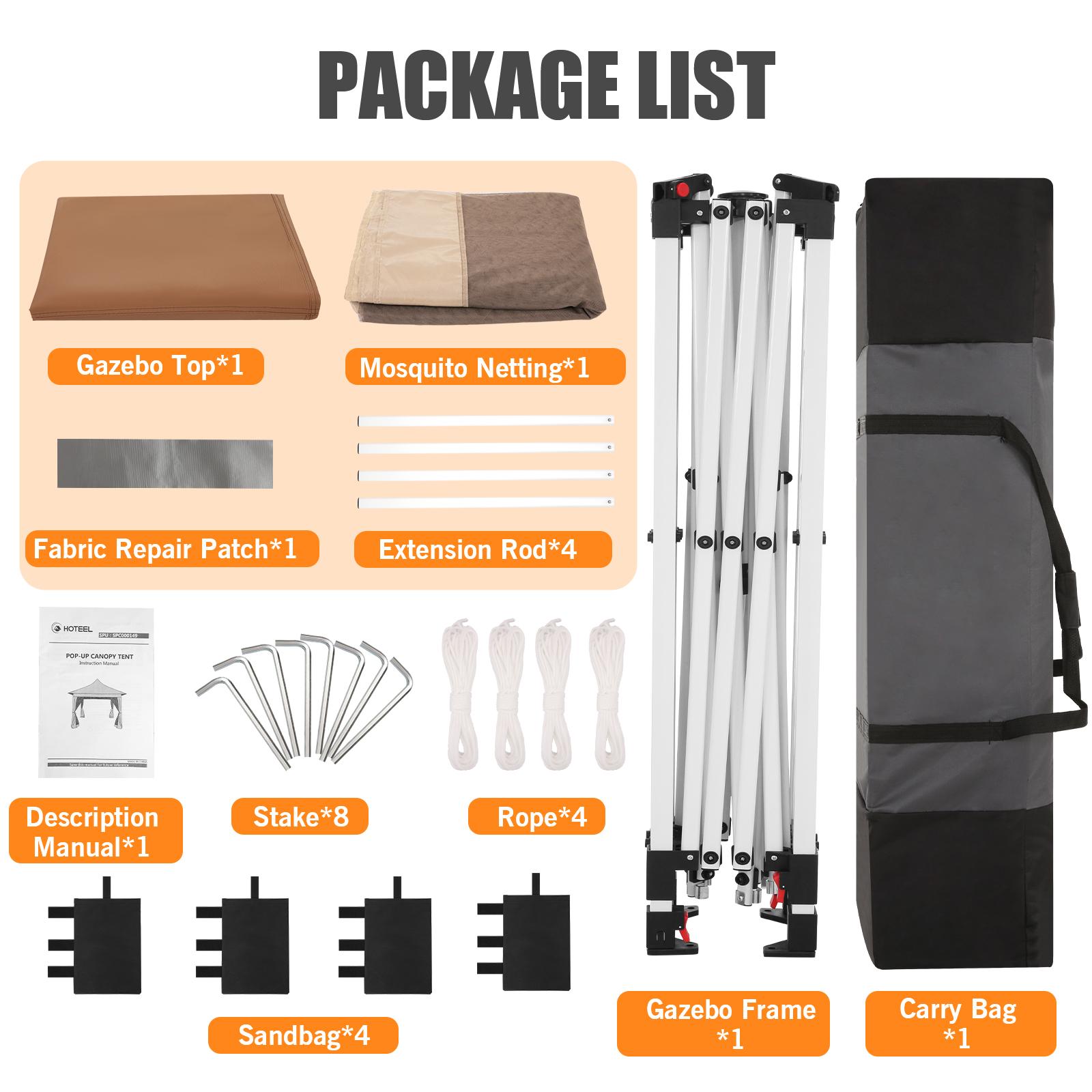 - ✅【Complete Accessories & Multipul-purpose】What You can get from the package: 1 carry bag, 1 gazebo frame, 2 canopy tops, 1 mosquito netting, 8 stakes, 4 sandbags and 4 ropes. This outdoor gazebo storage bag makes it easy to store in your car trunk or garage. Our backyard gazebo has three heights for you to adjust, allowing you use our gazebo for backyard, patio, camping, parties or wherever you want.