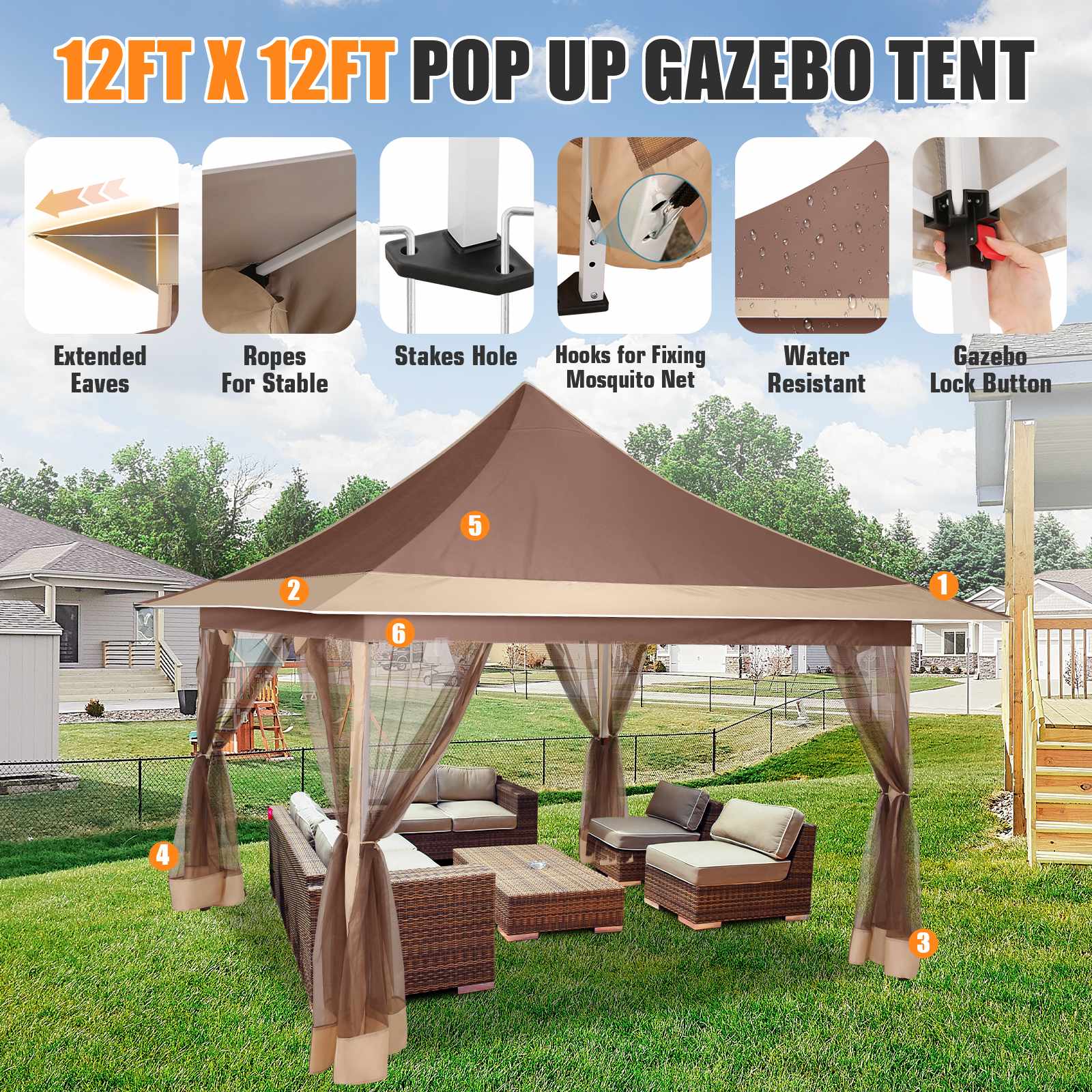 C - 12x12 Pop Up Gazebo Canopy Tent Easy Up Outdoor Gazebo Waterproof Upgrade Portable Gazebo with Mosquito Nettings and Carry Bag for Patio Garden Lawn