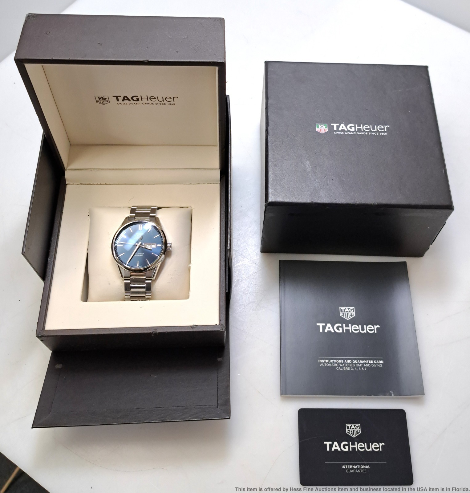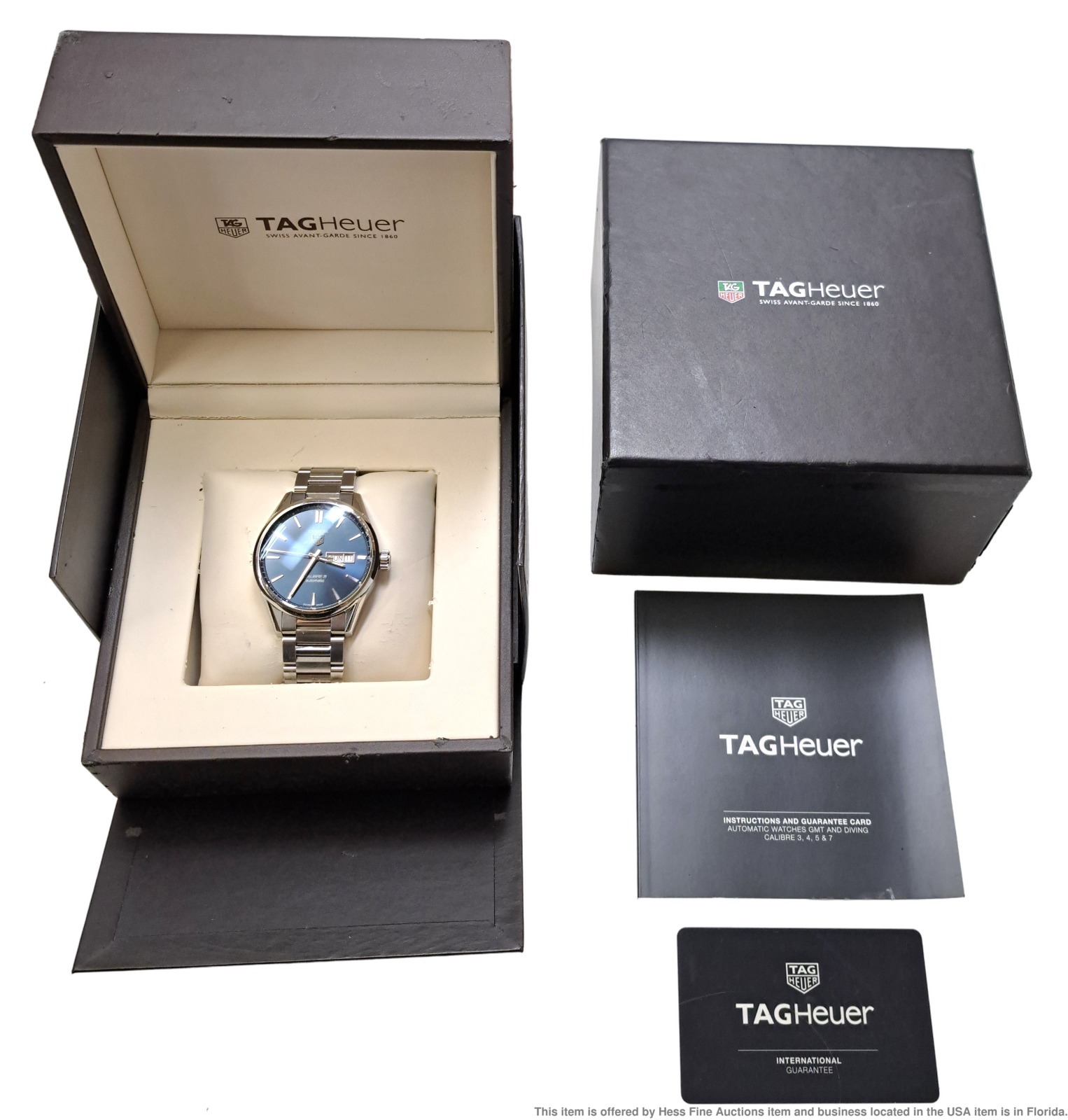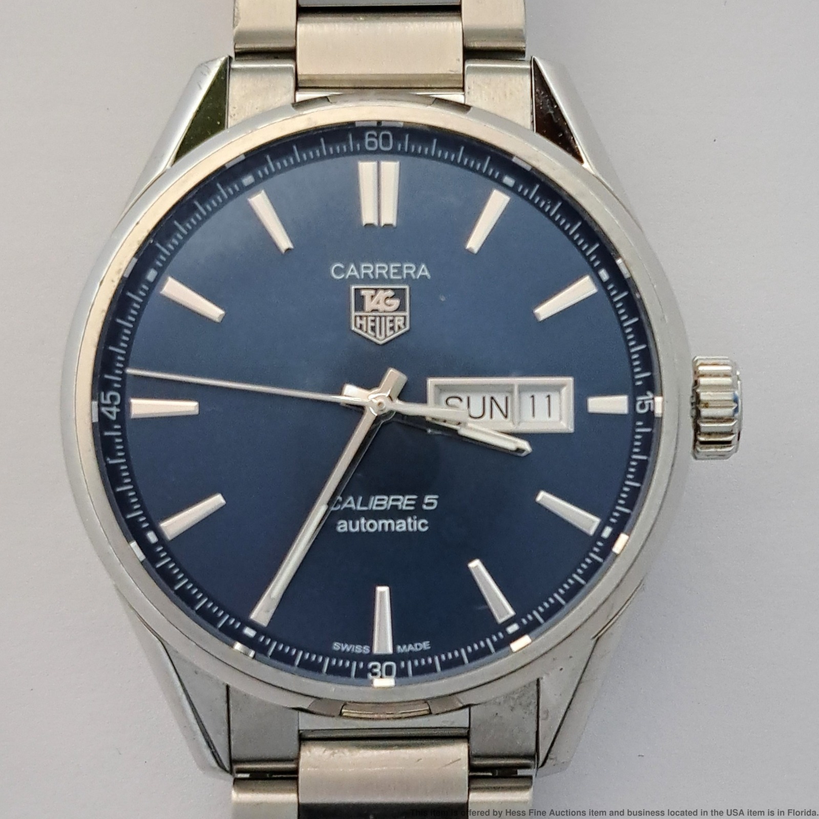 - Preowned with wear consistent with age but well preserved overall! Dial and crystal are in great condition. Bezel shows signs of user wear. Overall surface wear to case and case back, refer to photos. Bracelet shows overall user wear. Inside box showing some wear. Described By: Sam 70222 NTDD Title: Tag Heuer Calibre 5 Ref Stainless Steel Mens Wrist Watch w/ Box Warranty Papers Description: Tag Heuer Calibre 5 Ref Stainless Steel Mens Wrist Watch w/ Box Warranty Papers. Condition: Preowned with wear consistent with age but well preserved overall! Dial and crystal are in great condition. Bezel shows signs of user wear. Overall surface wear to case and case back, refer to photos. Bracelet shows overall user wear. Inside box showing some wear. Movement Condition: Movement is running. For optimum timekeeping accuracy we suggest an overhaul at buyers expense Case Size: 43 mm Case Thickness: 13 mm Lug End to End: 50 mm Lug Width: 20 mm Total Length or Circumference: 7 1/2 in circumference Material: Stainless steel case and bracelet Estimated weight of piece: 166 grams Box & Papers: Yes Estimated size of package: 10.5 x 8.5 x 6.5; 2 lb 8oz Additional Info: If the winning bidder would like to arrange to pick up their item at our store, please notify us by email and we will make the appropriate shipping adjustments.