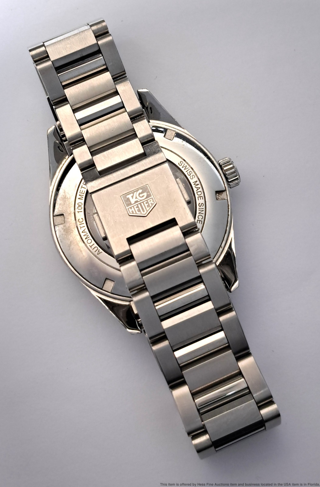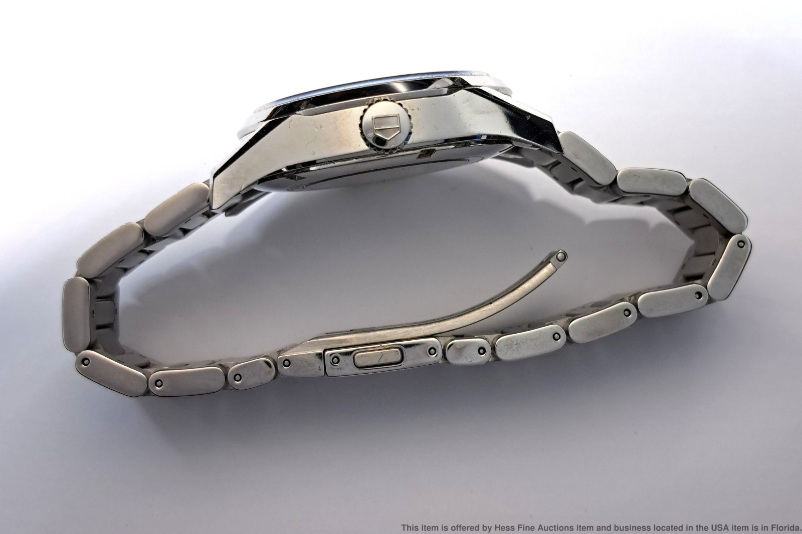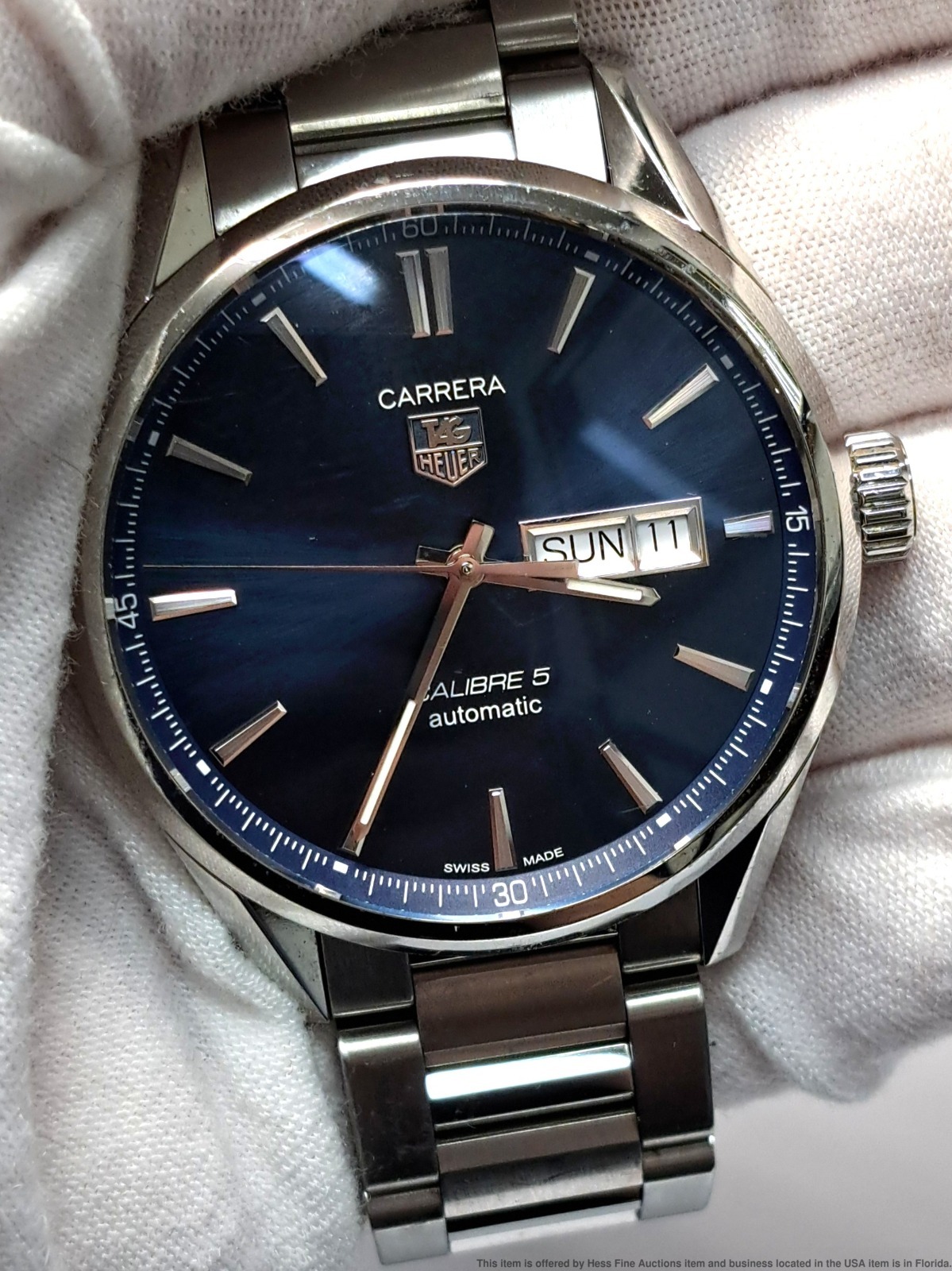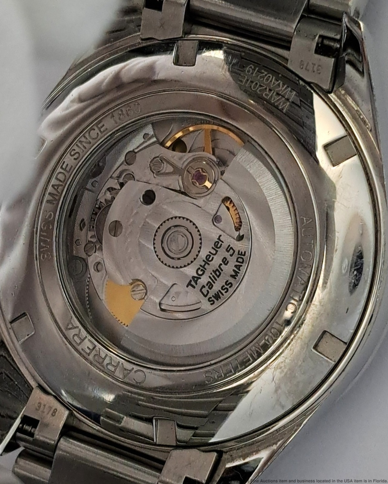 - Preowned with wear consistent with age but well preserved overall! Dial and crystal are in great condition. Bezel shows signs of user wear. Overall surface wear to case and case back, refer to photos. Bracelet shows overall user wear. Inside box showing some wear. Described By: Sam 70222 NTDD Title: Tag Heuer Calibre 5 Ref Stainless Steel Mens Wrist Watch w/ Box Warranty Papers Description: Tag Heuer Calibre 5 Ref Stainless Steel Mens Wrist Watch w/ Box Warranty Papers. Condition: Preowned with wear consistent with age but well preserved overall! Dial and crystal are in great condition. Bezel shows signs of user wear. Overall surface wear to case and case back, refer to photos. Bracelet shows overall user wear. Inside box showing some wear. Movement Condition: Movement is running. For optimum timekeeping accuracy we suggest an overhaul at buyers expense Case Size: 43 mm Case Thickness: 13 mm Lug End to End: 50 mm Lug Width: 20 mm Total Length or Circumference: 7 1/2 in circumference Material: Stainless steel case and bracelet Estimated weight of piece: 166 grams Box & Papers: Yes Estimated size of package: 10.5 x 8.5 x 6.5; 2 lb 8oz Additional Info: If the winning bidder would like to arrange to pick up their item at our store, please notify us by email and we will make the appropriate shipping adjustments.