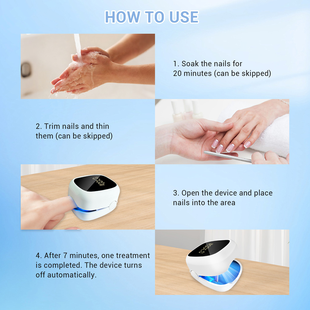 just place the infected nail into the device to start. The 7-minute auto-shutoff ensures safe and precise treatment every time.