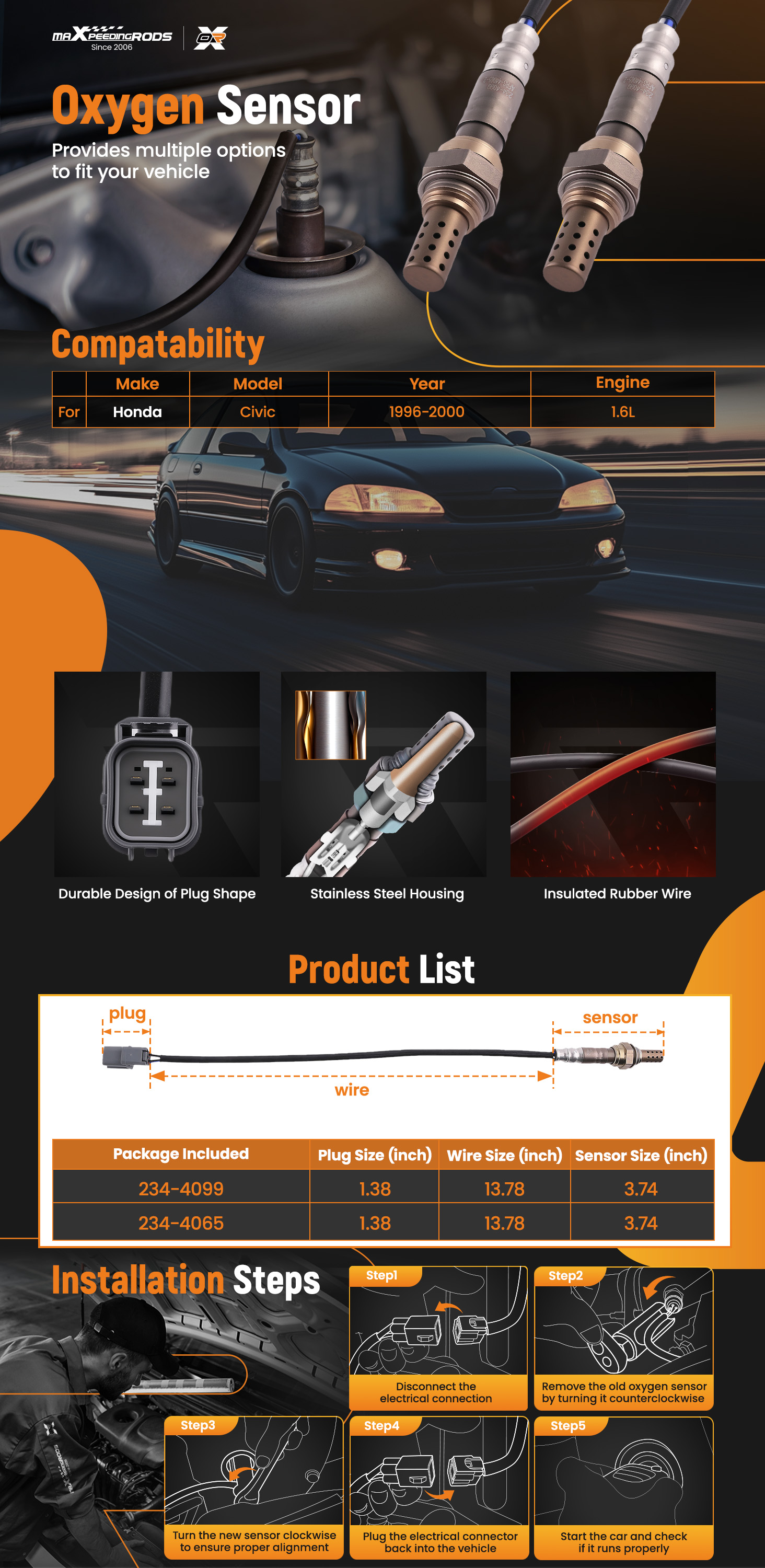 【High Quality Mateial】The oxygen sensor is equipped with a stainless steel housing. Durable and corrosion-resistant, ensuring your engine's long-lasting and stable performance.