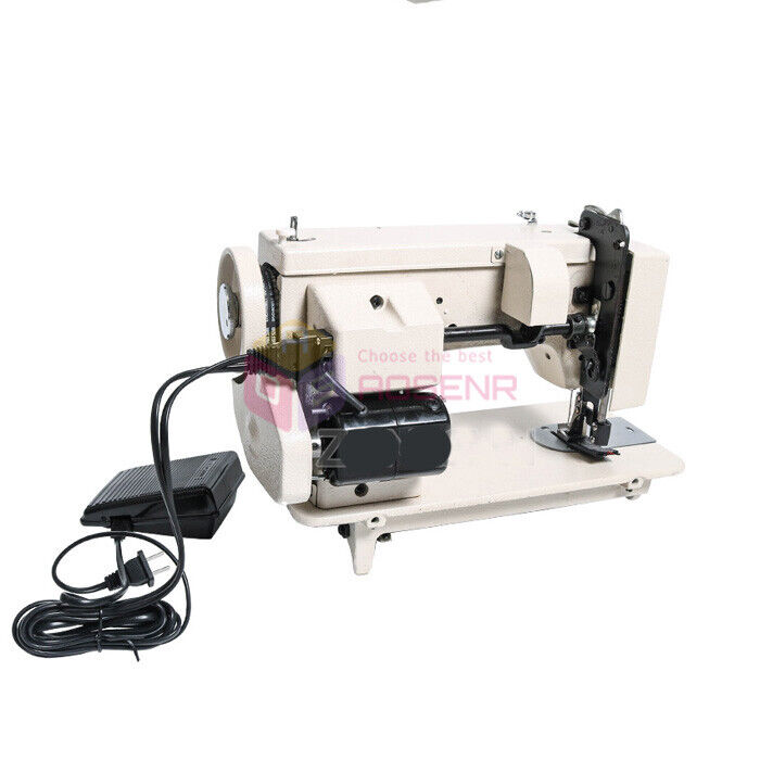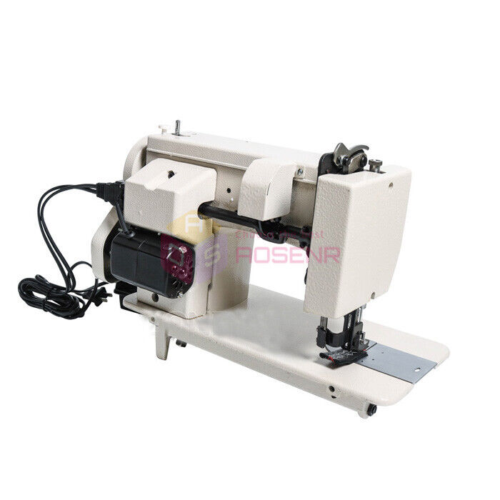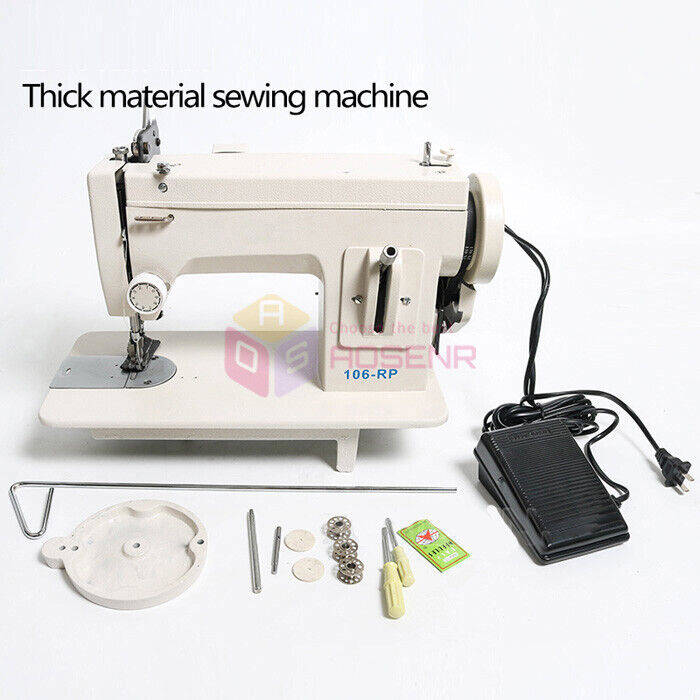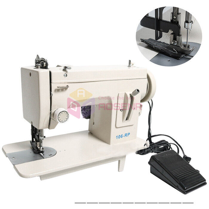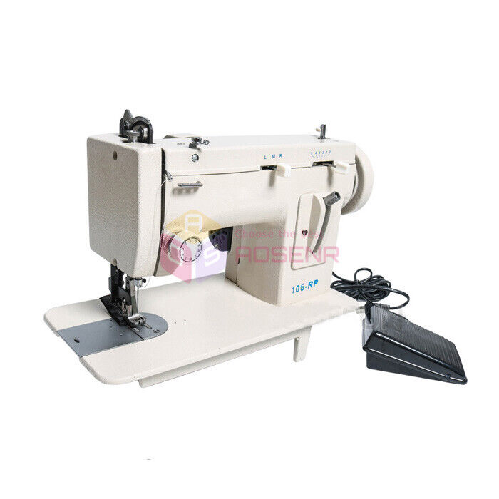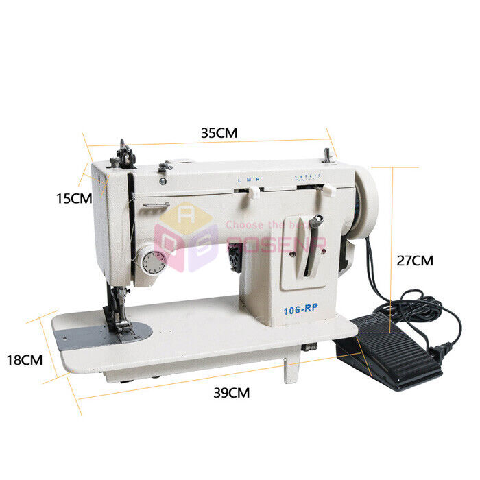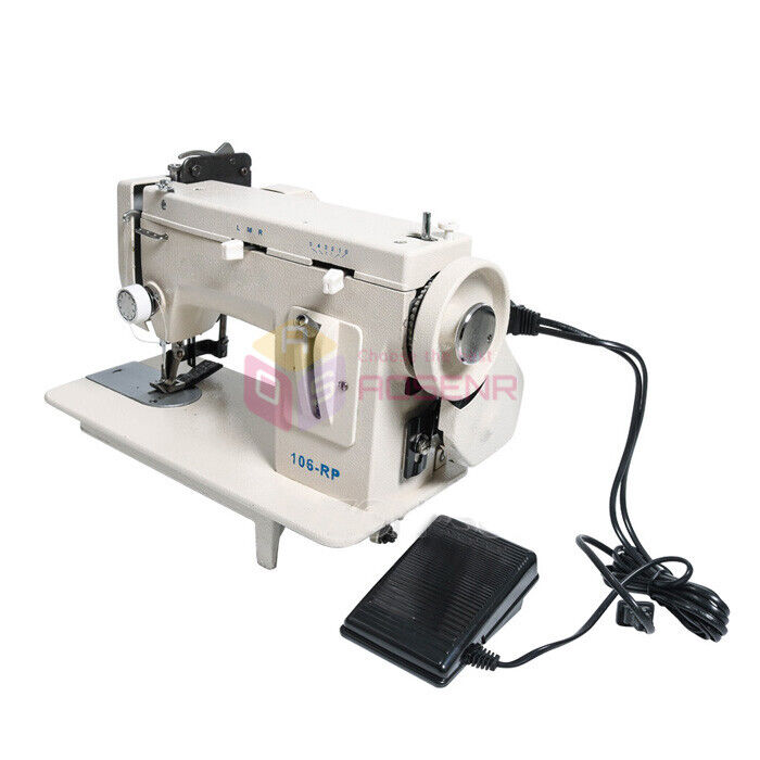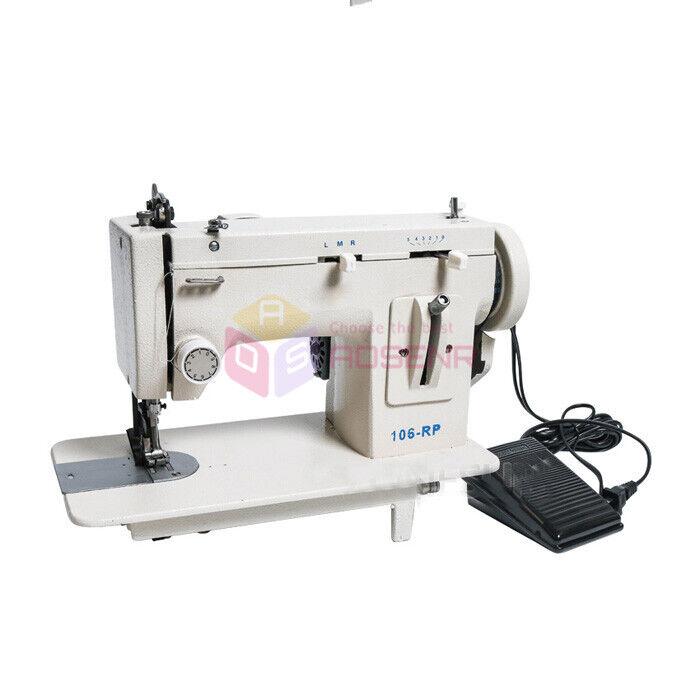 This mini 106-RP industrial straight portable walking foot sewing machine is designed to use nylon bonded,fire retard or polyester thread for sewing on exterior weight upholstery fabric's. The mini 106-RP is designed for handle such materials as:(light upholstery, leather, drapery, vinyl, canvas and umbrellas. The 106-RP model has a class 15 metal bobbin case with a oscillating shuttle, with a Top Darning knob to adjust to material and a top loading class 15 metal bobbin. The Motor is designed with a 150 Watt, 1.5 Amp, 110 Volt or 220 Volt, 50/60 hz Cycle Motor with a geared & cleated motor belt drive, cogged hand-wheel and sturdy motor pulley. This is a portable straight stitch machine with three position needle (L.C.R.),it has a adjustable lock reverse lever for easy adjusting the stitch length and reverse stitching. The top presser foot lift is 1/4" high for materials and welting foot size is available 1/4" for your cording. And it only takes one drop of clear oil on metal to metal moving parts, whenever it sounds louder than when you first purchased it and the 106-RP uses either: (Groz Beckert or Organ),Size:14,16,18,20,21,23 System 135 x 17 Needles.