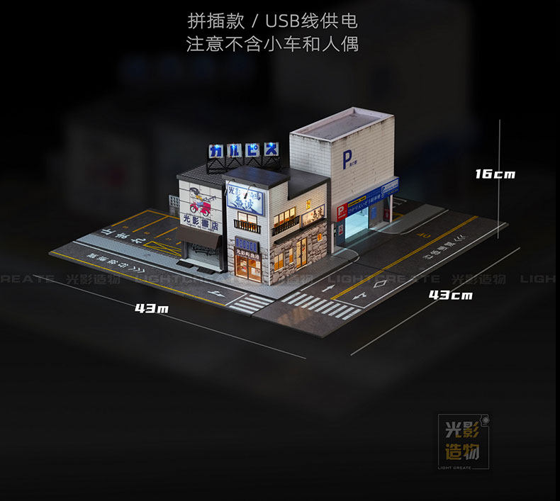 ### 📦 **Product Highlights** - **Authentic Street Atmosphere**: This 1:64 scale diorama brings a bustling corner of the city to life, featuring a movie theater, retro arcade, and a parking building. The realistic weathering and detailed signage capture the vibe of a lively neighborhood. - **Built-in Lighting**: LED lights illuminate the shopfronts, windows, and street signs, creating a warm, inviting glow that transitions seamlessly from day to night. Powered by a USB cable for easy, continuous use. - **Easy Assembly**: A pre-cut plug-and-play kit that requires no glue or complex tools. Simply follow the instructions to snap the pieces together for a sturdy, professional finish. - **Versatile Display**: Perfect for displaying your 1:64 diecast cars, model figures, or photography projects. The modular design also lets you combine it with other Light Create dioramas for an even larger city layout.