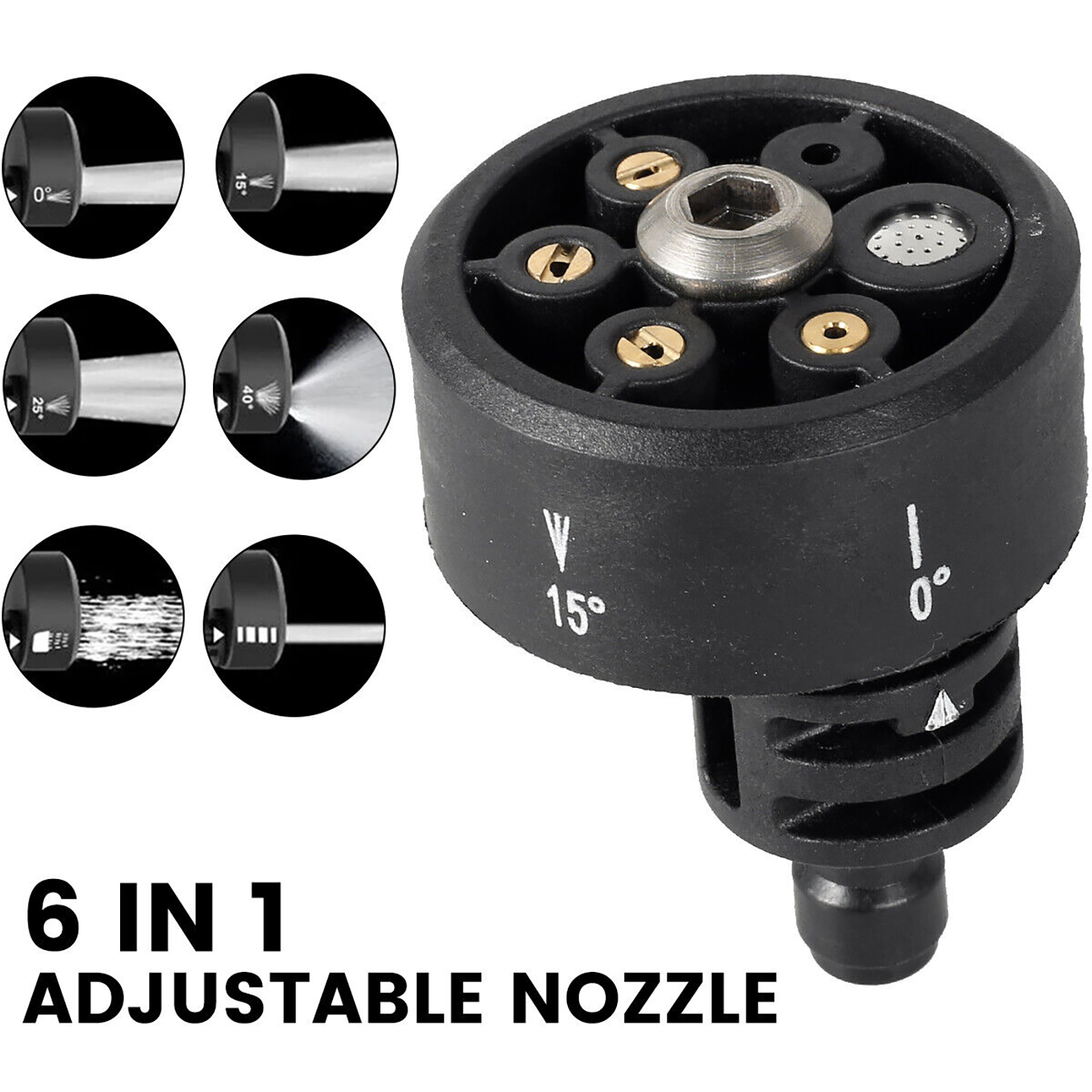 This washer nozzle is a 6-in-1 multi-angle nozzle; multi-angle nozzles can better clean surfaces and deep dirt.