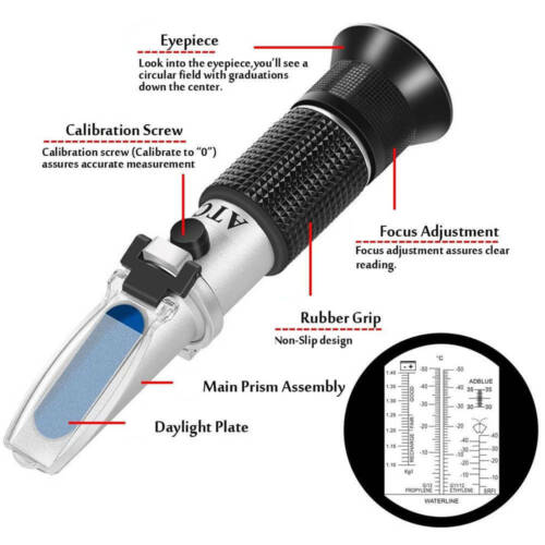 Dieser Stil ist mit °C Unit System ausgestattet. Mit der Angabe des Prozentsatzes können wir den Gefrierpunkt von Ethylenglykol- oder Propylenglykol-basierten Kühlsystemen kennen. Und sie können auch verwendet werden, um die Konzentration von Ethylenglykol oder Propylenglykol in Frostschutzflüssigkeiten zu testen. Zusätzlich gibt es eine zusätzliche Skala zur Messung des Gefrierpunktes von Windschutzscheibenreinigungsflüssigkeit. Es ist VOLLSTÄNDIG mit ATC ausgestattet, das sich automatisch anpasst, um Temperaturunterschiede während des Gebrauchs zu korrigieren.