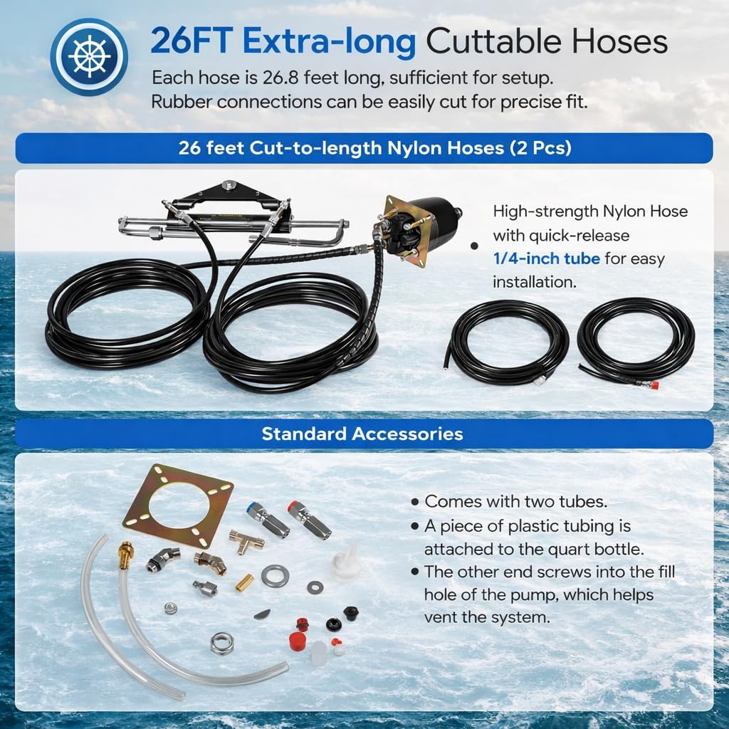 【Efficient 150 HP Hydraulic Helm Pump】 Replaceable shaft seal to protect fluid from leaking, and the shaft seal is easy to replace. 【2 Pcs 26ft Extra Long Cuttable Hose】 Each hose is 26.8 feet long and the rudder connections can be cut to suit your specific installation. Also, the kit comes with two tubes. A piece of plastic tubing is attached to the quart bottle and the other end screws into the fill hole of the pump, which helps vent the system.