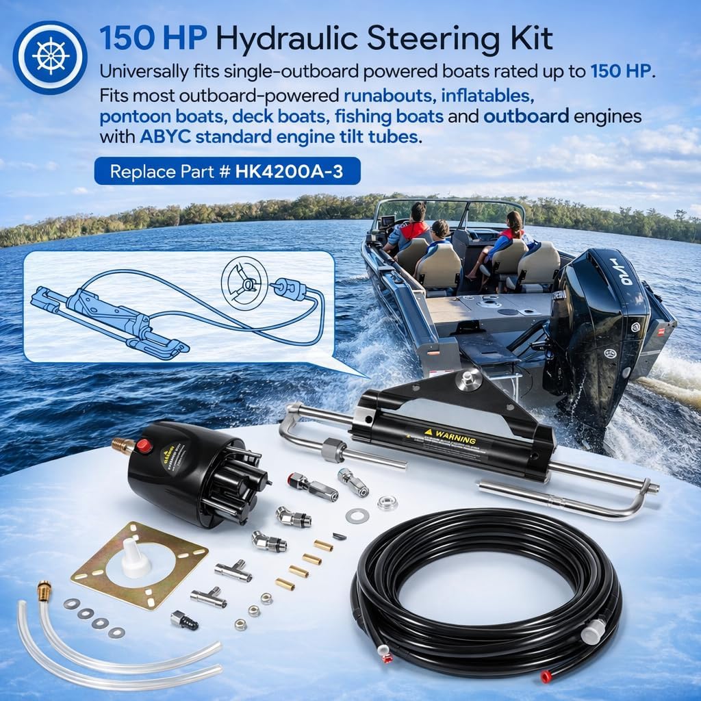![]() | 【Complete Hydraulic Outboard Steering Kit】 Qty-1 balanced steering cylinder, Qty-1 low-friction helm, Qty-2 lengths of 26.8ft (322.8in/8.1m) hoses, and a set of fill kit. Perfectly replace your aging or broken equipment. Complete hydraulic Directional System is suitable for most outboards. Makes steering easy and boating more enjoyable. Replace Part # HK4200A-3.