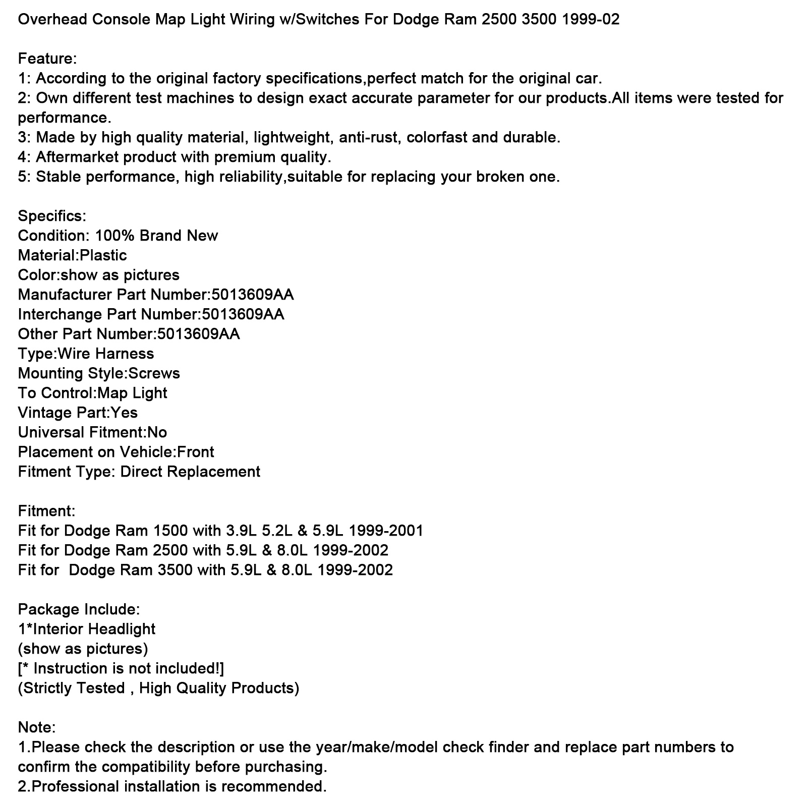 Overhead Console Map Light Wiring w/Switches For Dodge Ram 2500 3500 1999-02