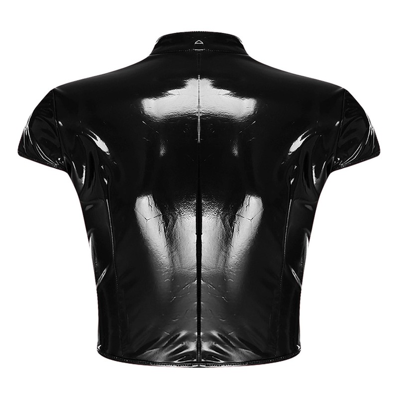 Made from a blend of polyester, PU, and spandex, the crop top offers a stretchy and comfortable fit while having a shiny wet-look finish that is on-trend this season.