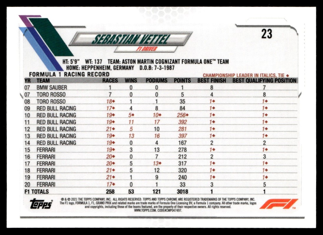 2021 Topps Chrome Formula 1 Sebastian Vettel Aston Martin Cognizant F1 #23