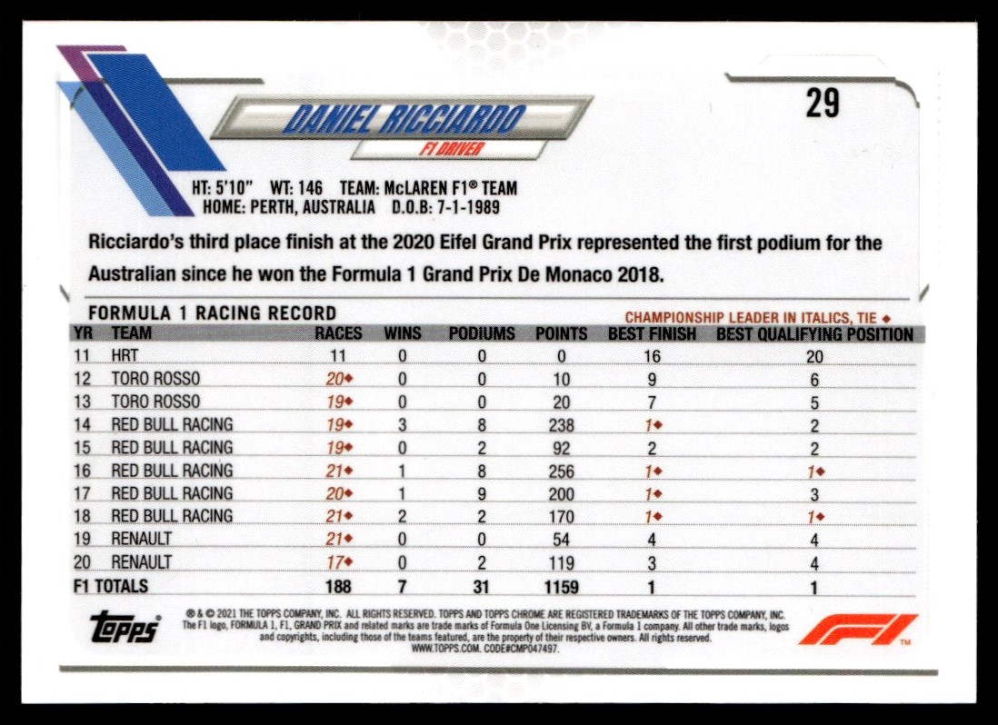 2021 Topps Chrome Formula 1 Daniel Ricciardo McLaren F1 Team #29