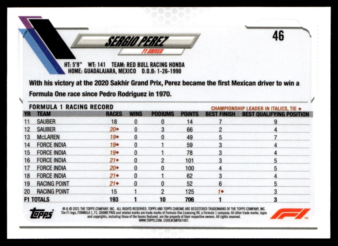 2021 Topps Chrome Formula 1 Sergio Perez Red Bull Racing Honda #46