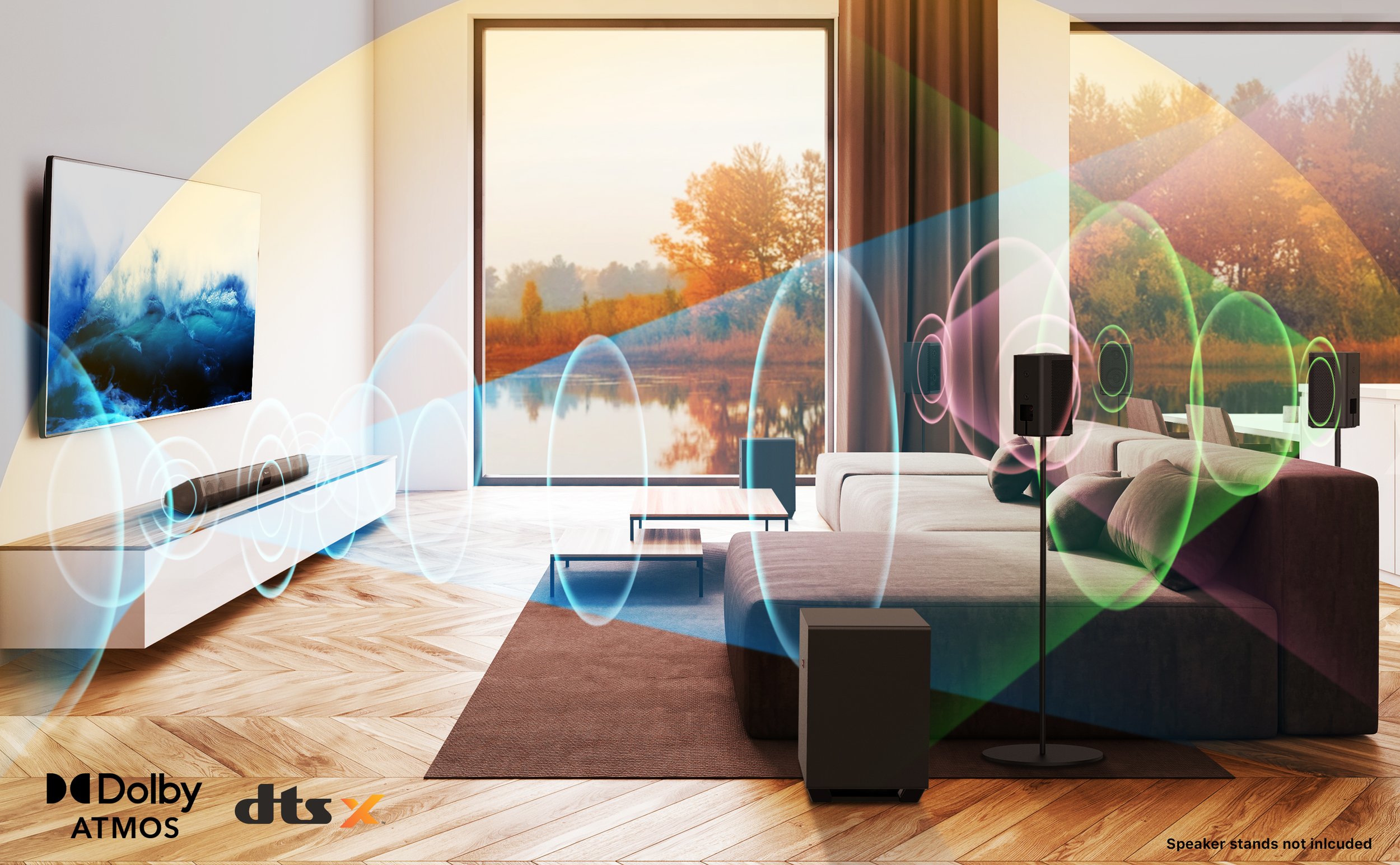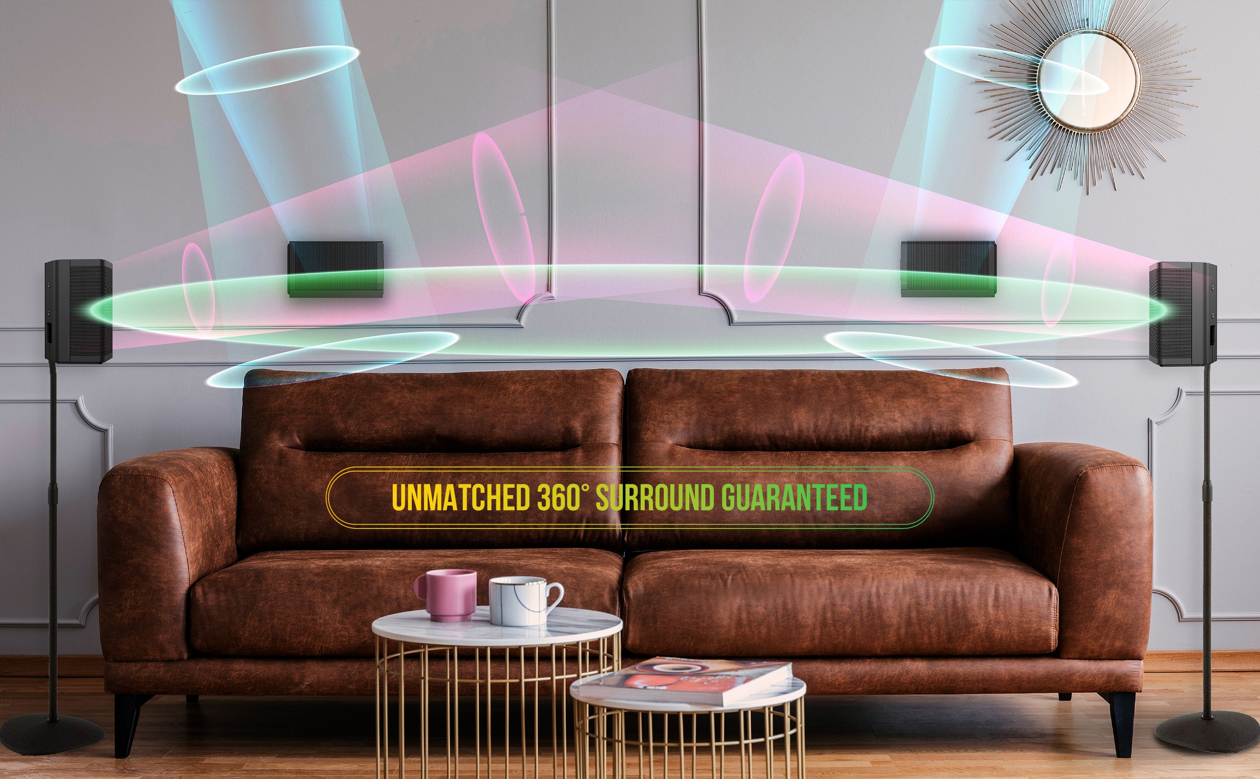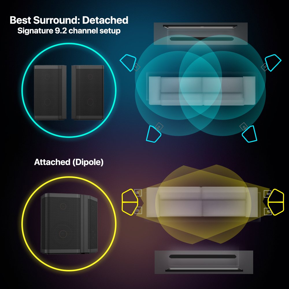 ![]() 360° Surround in Any Room Enjoy unmatched surround with our signature 9.2 channel setup. For smaller rooms, attach the surround speakers together to form a pair of dipole speakers. The sound will reverberate off walls to create the same 360° cinematic environment. |