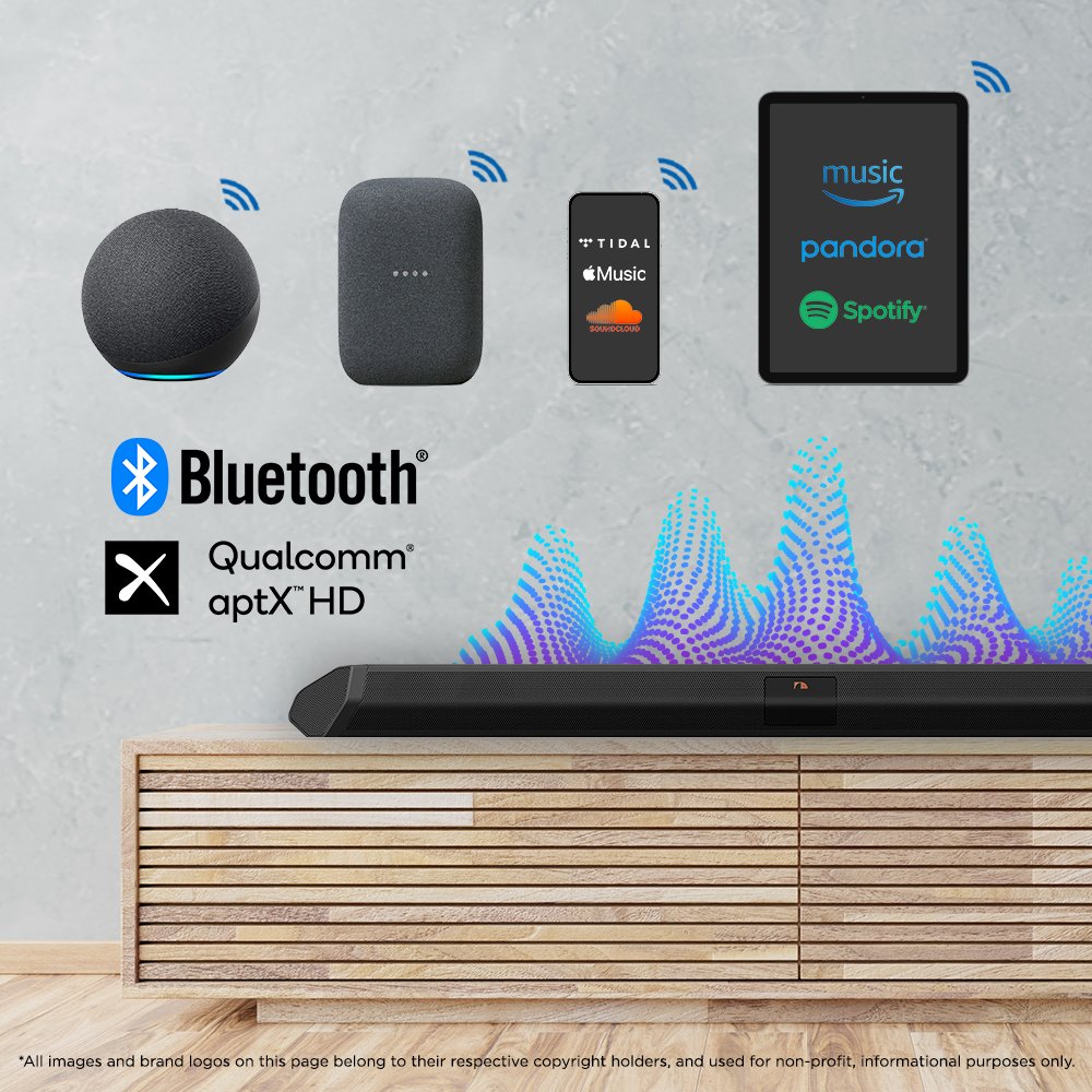 ![]() Enjoy Better-than-CD Sound Quality - Wirelessly The world’s first soundbar with Qualcomm aptX HD™, stream your favorite tunes in up to 24-bit music quality from your smart phone, tablet or laptop via Bluetooth 5.0. Hear even the smallest details in your music. |