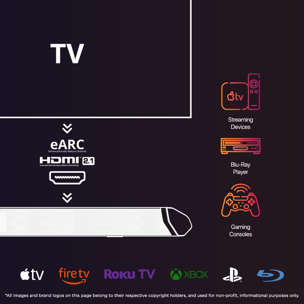 ![]() Future-Proof Connectivity HDMI eARC enables the soundbar to receive full quality, lossless audio. With 3 HDMI 2.1 inputs, you can conveniently connect multiple devices to your soundbar. |