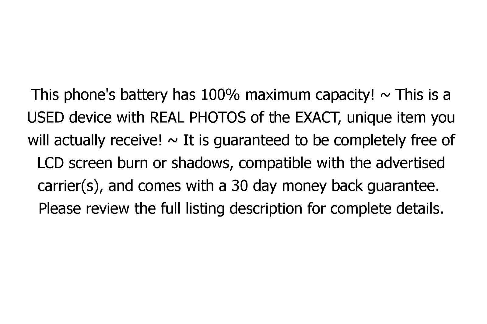 IMPORTANT NOTES: This phone's battery has 100% maximum capacity! ~ This is a USED device with REAL PHOTOS of the EXACT, unique item you will actually receive! ~ It is guaranteed to be completely free of LCD screen burn or shadows, compatible with the advertised carrier(s), and comes with a 30 day money back guarantee. Please review the full listing description for complete details. Generic Description: |