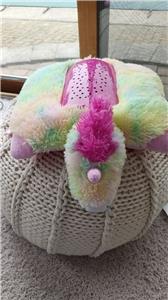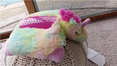 You are looking at a My Pillow Pets Dream Lites Unicorn Light Up Pillow that is in EUC. This is a rainbow sherbert colored unicorn. She lights up with 3 AAA batteries (not included). Just tested and looks great. She's clean and has been in the closet. I am not sure why my son got this (I think he just wanted it despite being a unicorn). From 2011. She is 11 inches by 13 inches. Super cute!
