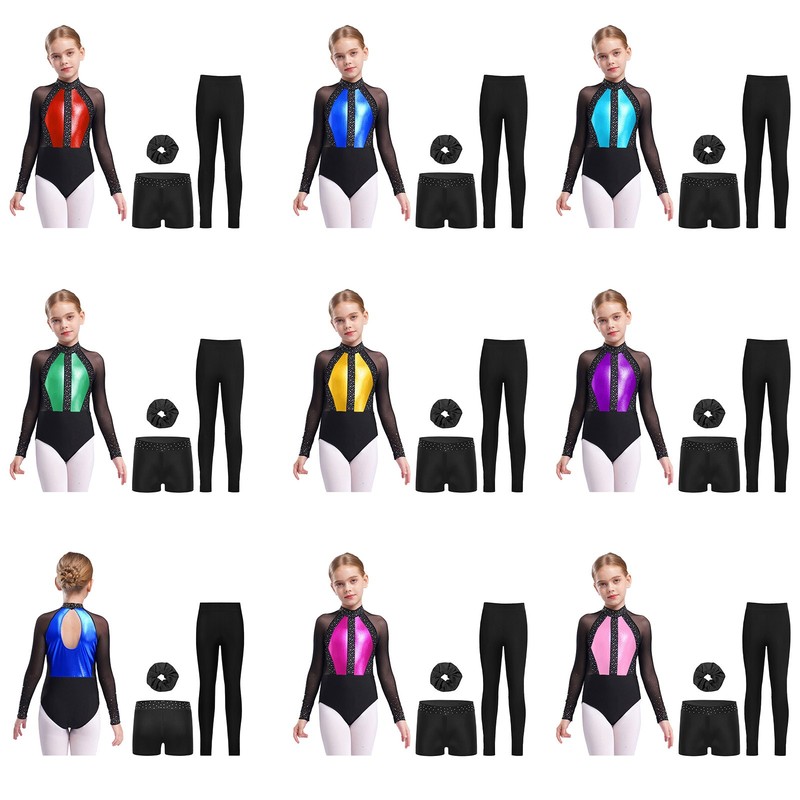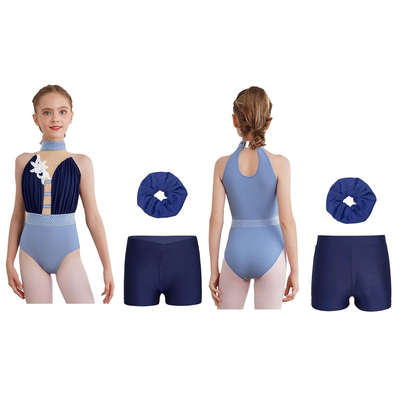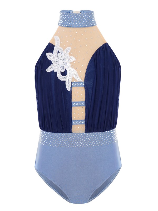 The mesh patchwork with applique and rhinestones create a dazzling effect, making your girl stand out in the performance and giving her a glamorous and eye-catching appearance.