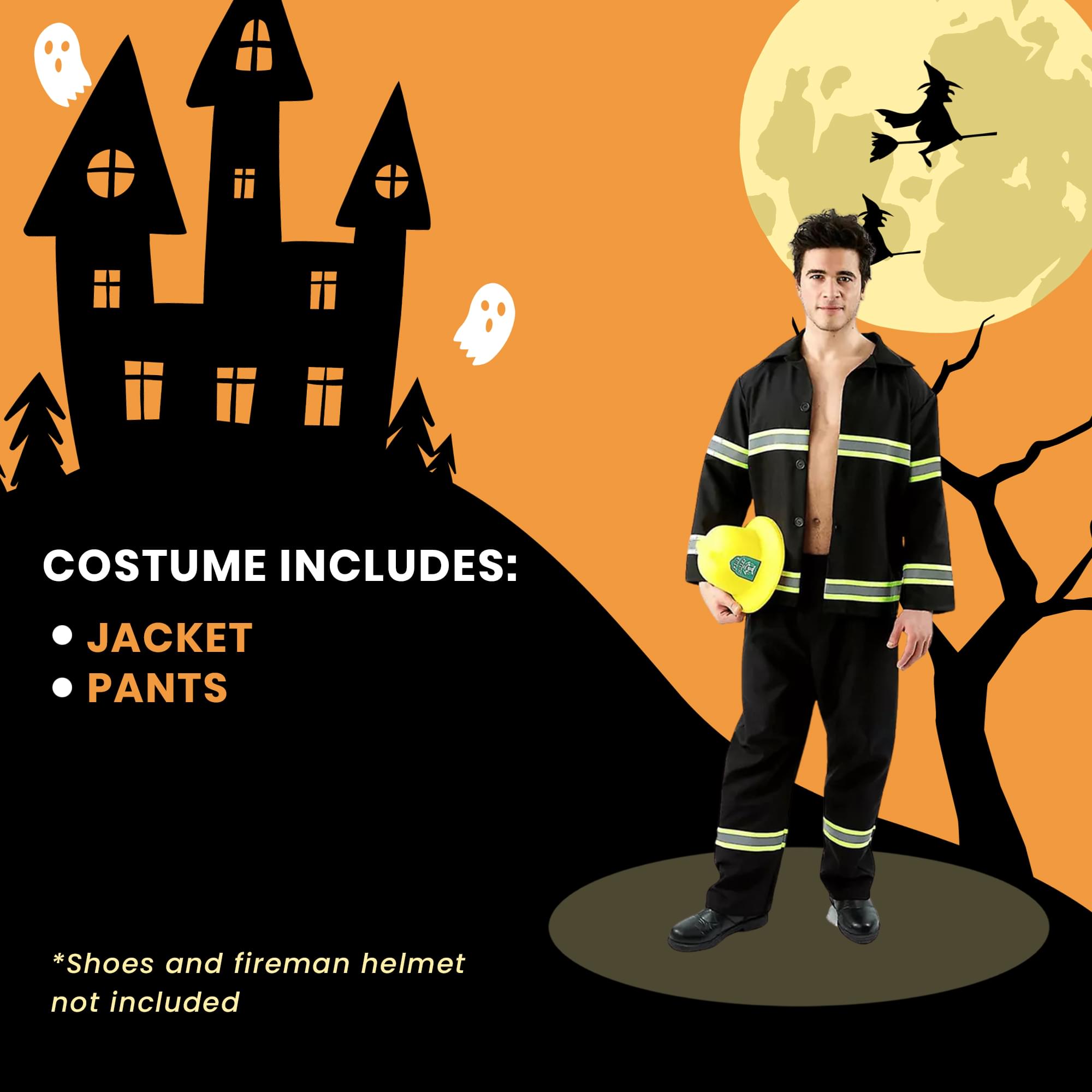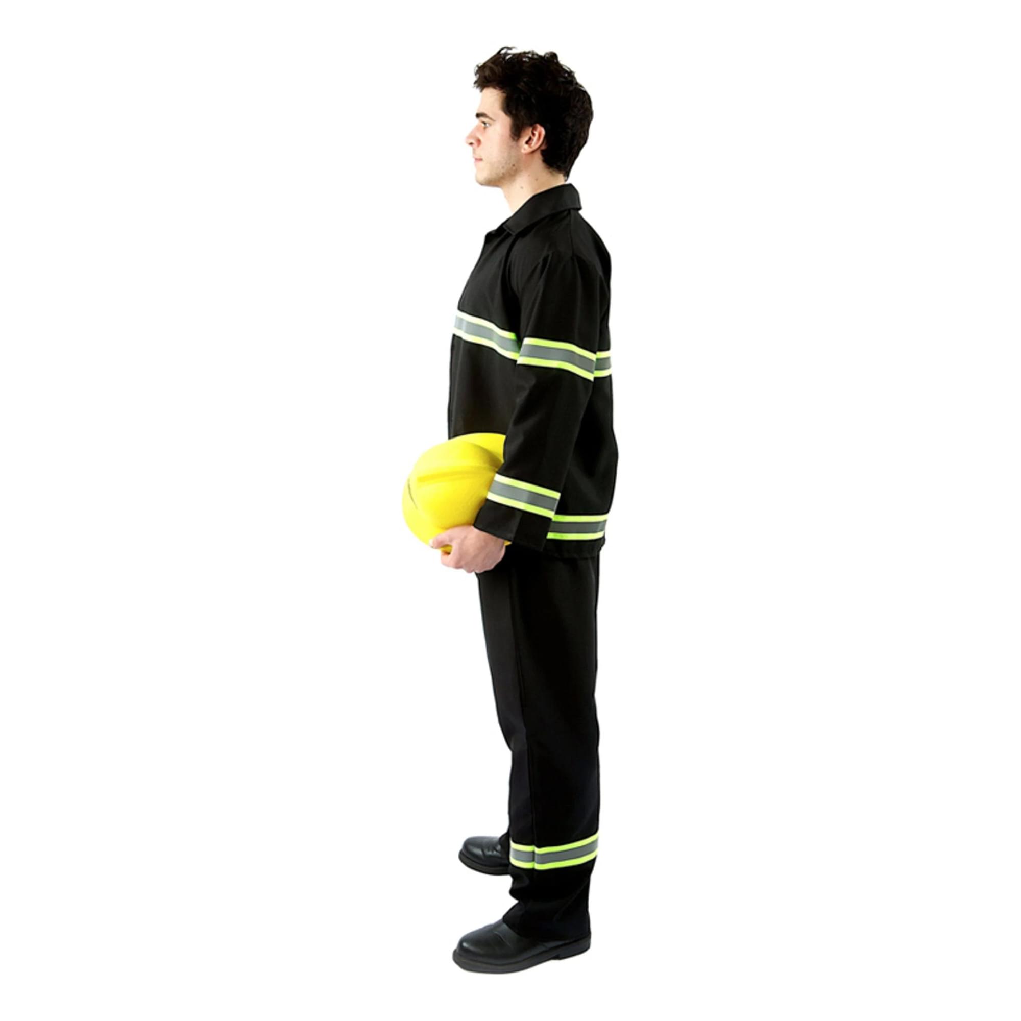 • COSTUME INCLUDES: A pair of black trousers and a matching jacket, both with reflective florescent strips. Trousers have an elasticated waistband. Excludes fireman helmet.