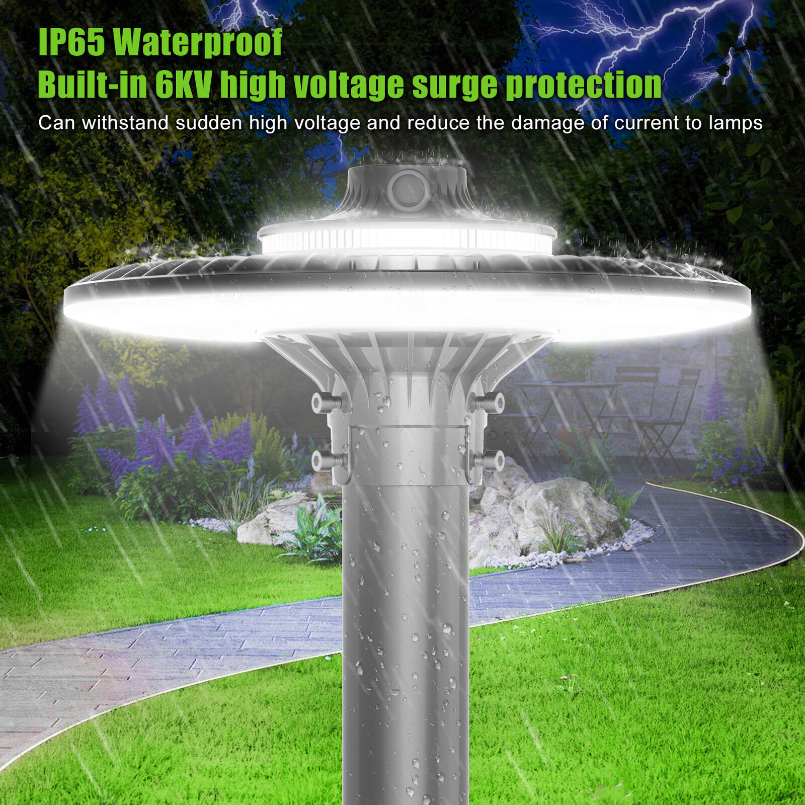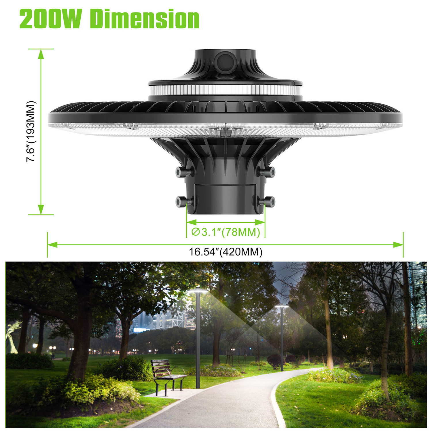 360 Degree wide angle & Top lighting-This 200W LED garden light post can product 28000 Lumens with high efficiency SMD2835 chips in lenses distributed on a UFO-shaped panel, providing a super bright light over a wide area