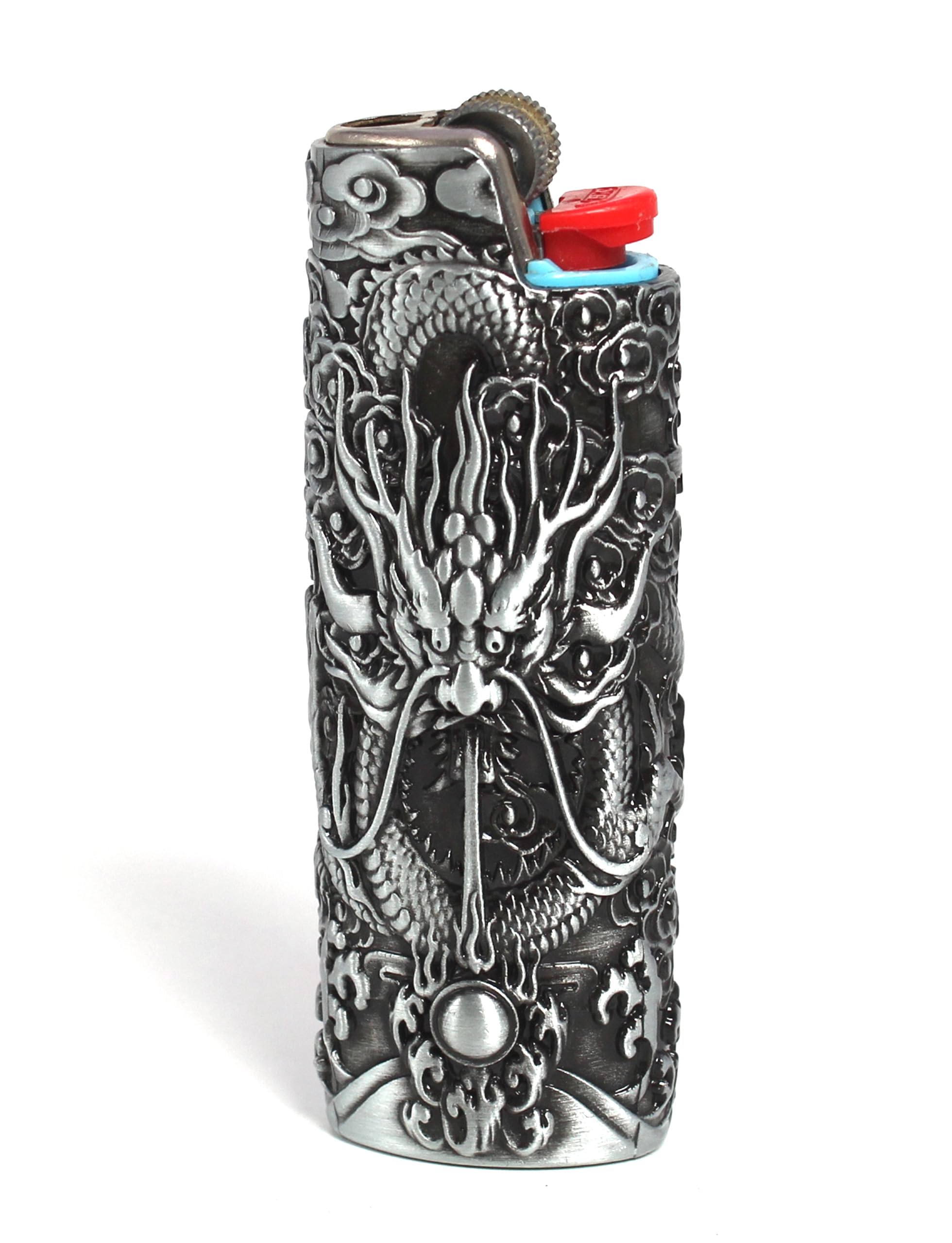 Elevate your everyday carry with this exquisitely detailed lighter case featuring an intricate dragon design. The metallic case showcases masterful relief work with a fierce dragon motif surrounded by traditional clouds and decorative elements. Available in both antique brass and silver finishes, this durable metal case fits standard BIC lighters and transforms them into stunning accessories. The detailed sculptural work brings the mythical dragon to life with its scales, flowing whiskers, and dynamic pose against a richly textured background. The case features a practical design with easy access to the lighter's controls while providing protection and style. Perfect for collectors and anyone seeking to add an artistic touch to their daily items, this lighter case makes an impressive gift or personal statement piece.