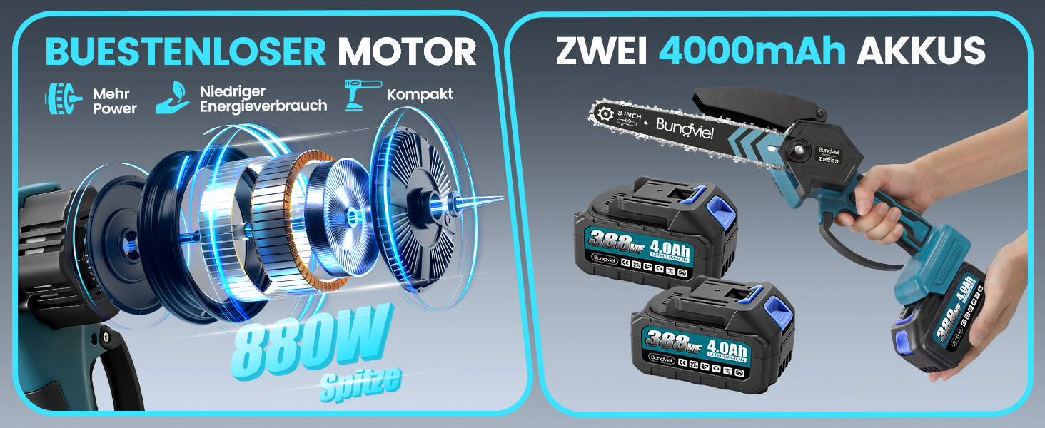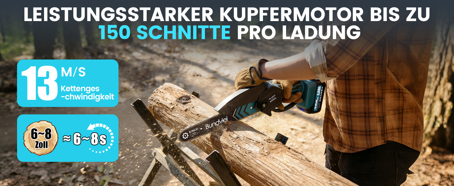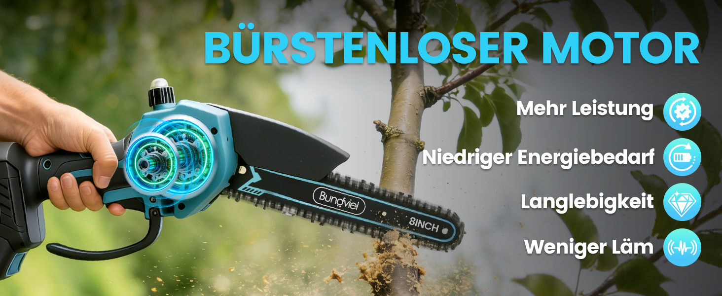 Höchste Effizienz & Langlebigkeit: Der wartungsfreie Motor kombiniert mit einer stoßfesten Kette sorgt für robuste Schnittleistung selbst bei harten Materialien.