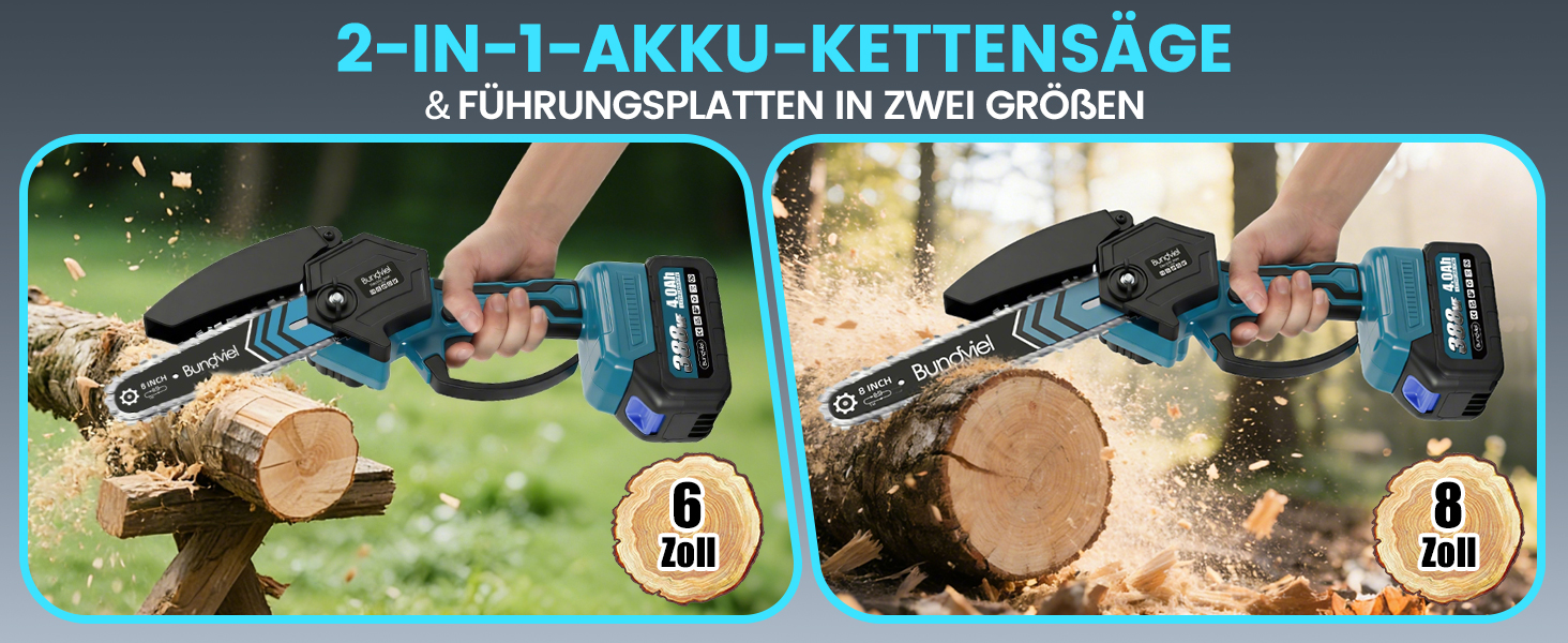 【2-in-1-Design, ausgestattet mit 6-Zoll- und 8-Zoll-Kettensäge】